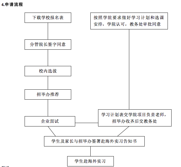 校内报名安排如下: 1.选拔对象: 我校非2013届毕业班的在读本科生和研究生,2014年春季班要求非2014届毕业生。 2.选拔标准: (1)拥护四项基本原则,思想品德良好,遵纪守法。 (2)本科生所修课程平均绩点文科专业不低于2.8,理科专业不低于2.5(绩点计算结果以教务处公布为准)。 (3)CET-4级考试达到426分;雅思(学术类)总分6.0分;托福总分570分(纸笔考试)/230分(计算机考试)/88分(网络考试),以上几项满足其一即可;如都不满足,口语和听力十分突出者也可报名;外国语学院英语系学生不需要提供英语能力证明。 (4)身体健康,符合出入境体格检查标准。 3.报名办法: 凡决定报名者,请下载《365上市公司学生海外项目申请表》(附件2),经学院教学院长签字盖章(研究生须研究生部签字同意)后交各学院项目负责老师(附件3),请各学院项目负责老师于6月5日下午3:00前统一送至校招毕办(校本部行政楼413室张艳虎老师处),过期不予受理。 (1)申请学生须自愿参与项目,并取得家长签字同意。 (2)申请报名的学生,必须下载《365上市公司学生海外项目申请表》(附件3),经学院和招毕办确认后方可参与实习,否则,将被视为个人行为,学生实习后续事宜,招毕办概不负责。 (3)本科生须取得辅导员或班主任的推荐,研究生需导师推荐。 (4)本科生申请需所在院(系)分管院长(系主任)签字同意,研究生需研究生部签字同意。 (5)出国应当按照学校规定办理休学手续,并可能造成本人延期毕业;同时应按照所在学院要求,做好相应的学习计划和选课安排,并经学院认可、教务处(研究生部)审批同意。 (6)申请报名的学生,请详细阅读附件的项目介绍。 (7)务必请学生在报名时与所在学院沟通好学习计划和学分认定事宜。项目结束后,由学生本人提出学分认定申请,交所在学院分管教学副院长审定,批准后报教学主管部门审批,被认定的学分,将根据《365上市公司学分制收费办法》收取学费。 (8)学校不收取任何费用。但每个取得实习机会的学生,须向主办方缴纳一定学费和生活费(参见附件2)。所有项目获得实习机会的研究生可向研究生部申请资助往返国际机票。 (9)所有项目都不是旅游项目,学生在国外期间需要独立去面对跨越不同国界和具有多元文化背景的成长环境,需要克服困难、承受压力、承担责任的决心和勇气。 (10)每名学生在同一年内只能参加一项学校开展的海外项目。如果在申请过程中因学生个人非不可抗力原因自行退出本项目,招毕办开展的其他海外实习项目,将不再接受其报名。 4.申请流程