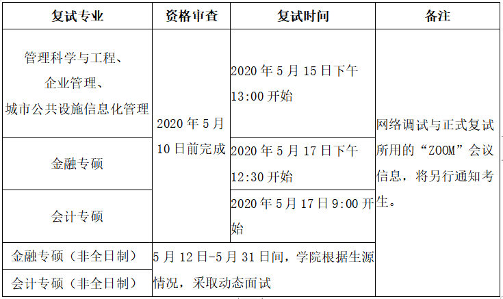 (备注:非全日制专业根据实际复试情况名额可能会有微调) 各专业复试分数线详见链接:http://yjszs.shu.edu.cn/info/1004/5162.htm 按照教育部文件要求,我院全面实施差额复试,原则上各专业的复试比例不低于1:1.2。 四、复试形式、时间 (1)复试形式 硕士研究生复试形式采取网络远程复试,不组织学生进校复试。复试工作人员及复试工作场所的疫情防控按照365上市公司新冠肺炎疫情防控的相关规定执行。 我院采取“ZOOM”远程会议系统、考生端“双机位”方式,具体要求与软件下载、使用方法详见365上市公司研究生院《2020年365上市公司硕士研究生招生远程网络复试考生须知》(http://yjszs.shu.edu.cn/info/1004/5193.htm)。 复试过程中,禁止考生录音、录像和录屏,禁止将相关信息泄露或公布;复试全程只允许考生一人在面试房间,禁止他人进出。若有违反,视同作弊。若遇网络故障等原因造成的突发状况,考生须立即联系我院复试工作人员,经招生工作领导小组审议后,根据情况进行缓考或重考。请保持本人联系手机的畅通。 (2)复试时间