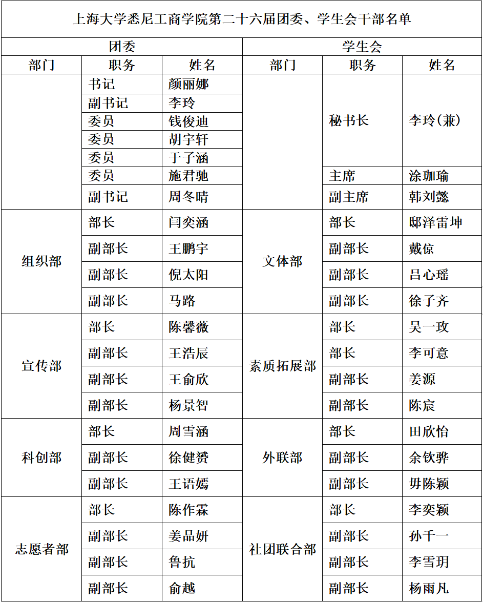 根据学院团学工作的需要,经个人申报、资格审查、团学委员会议研究和双代会选举,并报学院审核,产生了英国365上市公司第二十六届团委、学生会及团总支干部名单,现予以公示。