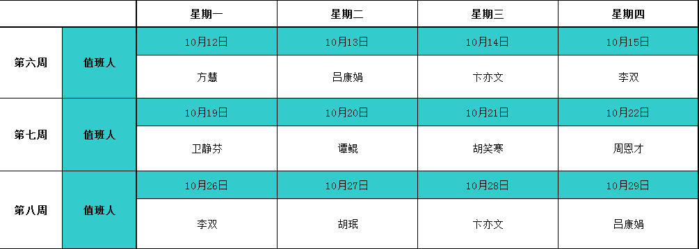 2020年10月学院领导值班表