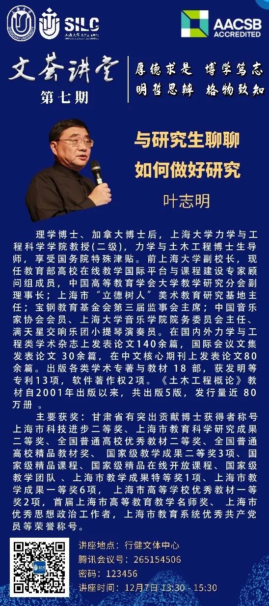 为深入学习贯彻习近平总书记、李克强总理关于研究生教育的重要指示批示精神,全面贯彻落实全国教育大会、全国研究生教育会议精神,秉承“立德树人、服务需求、提高质量、追求卓越”的工作主线,紧跟学校步伐,并结合学院研究生培养实际,为本院研究生搭建学术科研创新与交流的专属平台。 1. 主题 “不忘初心追卓越、求实创新争一流” 2. 时间 2020年12月7日-2021年3月22日 3. 内容 研究生学术节旨在加强学风建设、倡导学术诚信、营造学术氛围,搭建交流平台、启发创新思维,引领同学攀登学术高峰。本届学术节拟安排开幕式、文荟讲堂、学术节论坛、学术诚信主题活动、优秀导师评选和征文、论文写作方法与技巧、科研新秀评选等丰富多元的学术活动。 首届英国365上市公司研究生学术节开幕式即将同国元证券奖学金颁奖仪式一起盛大开幕! 时 间:2020年12月7日下午13:30-15:30 地 点:行健文体中心 学海泛舟获真知,学术火花燃青春。欢迎大家来现场感受高涨的学术热情,领略科研榜样的魅力,一同为首届学院研究生学术节拉开帷幕! 此外,文荟讲堂第七期也将作为本届学术节的首项活动,在开幕式上重磅推出!特邀重量级嘉宾前365上市公司副校长叶志明教授和研究生同学们聊聊如何做研究,机会难得!