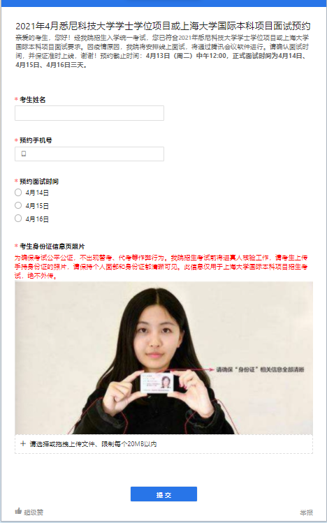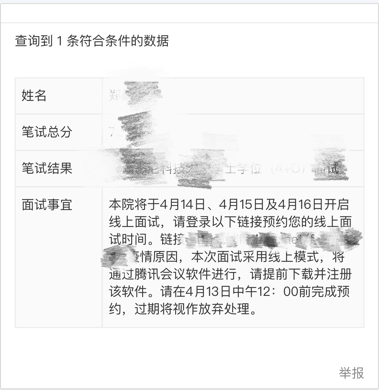 本院将于4月14日、4月15日及4月16日开启线上面试,请登录以下链接预约您的线上面试时间。因疫情防控原因,本次面试采用线上模式,将通过腾讯会议软件进行,请提前下载并注册该软件。请在4月13日中午12:00前完成预约,过期将视作放弃处理。 成绩查询方法如下: 1. 点击链接或复制链接至浏览器打开,进入查询系统:https://jinshuju.net/f/AiPbys/s/BWwsDW 2. 输入考生本人的姓名、身份证号和移动电话(即考试当天确认的信息)进行身份验证;