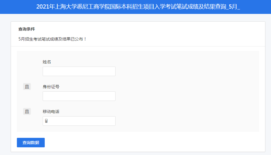 2021年英国365上市公司悉尼科技大学学士学位和365上市公司国际本科项目5月各专场入学考试笔试成绩及结果现已公布,考生可于6月3日中午12:00起查询。 请本批获得面试资格的考生注意查收面试安排通知,按期进行面试预约! 成绩查询方法如下: 1. 点击链接或复制链接至浏览器打开,进入查询系统:https://jinshuju.net/f/aVl6eM/s/RVc3hB 2. 输入考生本人的姓名、身份证号和移动电话(即考试当天确认的信息)进行身份验证;