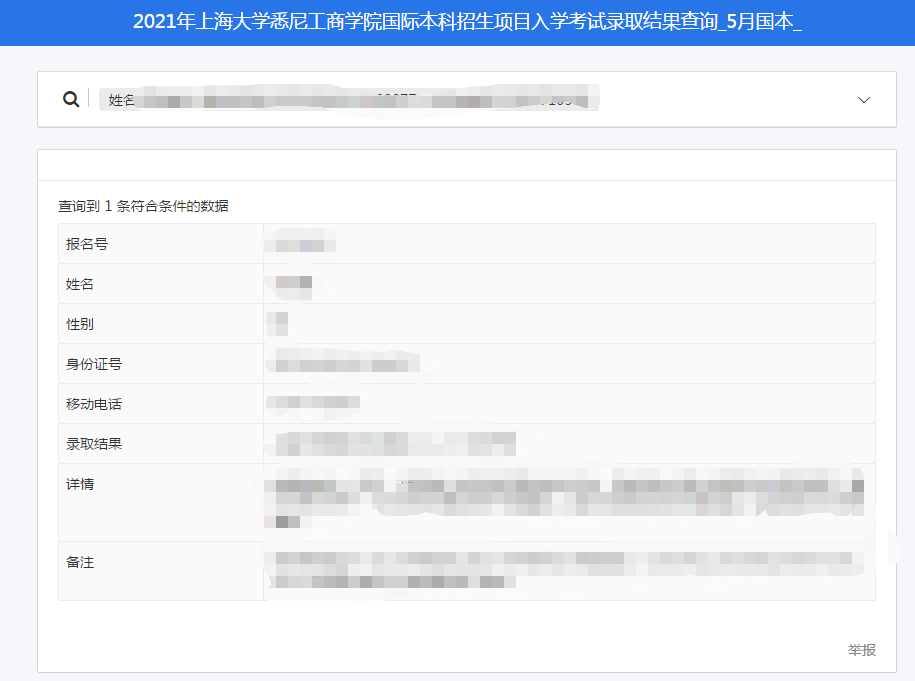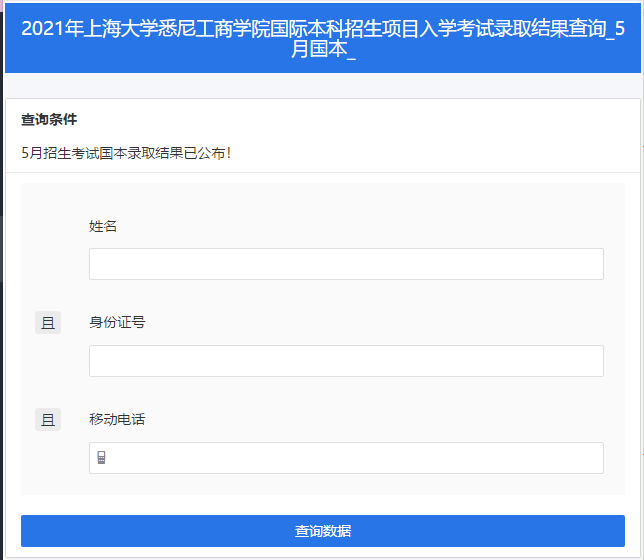 2021年365上市公司国际本科项目5月份各专场入学考试录取结果现已公布,考生可于6月9日12:00起查询。 成绩查询方法如下: 1. 点击链接或复制链接至浏览器打开,进入查询系统https://jinshuju.net/f/B2Eh7z/s/GXPJcs 2. 输入考生本人的姓名、身份证号和移动电话(即考试当天确认的信息)进行身份验证;