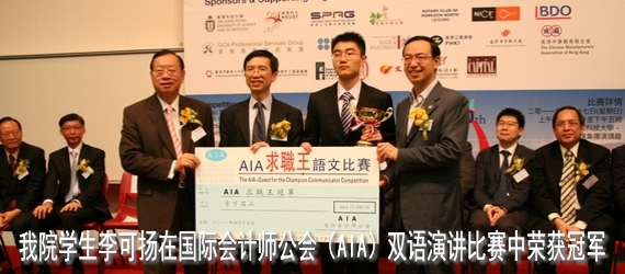 4月17日,第十届"AIA 求职王语文比赛"在香港科技大学举行。来自香港大学、香港中文大学、清华大学、中山大学、厦门大学、澳门大学等两岸三地共23所大学的学生参加了本次比赛。我院09级国贸专业学生李可扬同学在比赛中发挥出色,从 众多选手中脱颖而出,勇夺冠军,并获得AIA提供的实习机会。凤凰卫视对比赛进行了全程跟踪,并在赛后独家采访了李可扬同学。