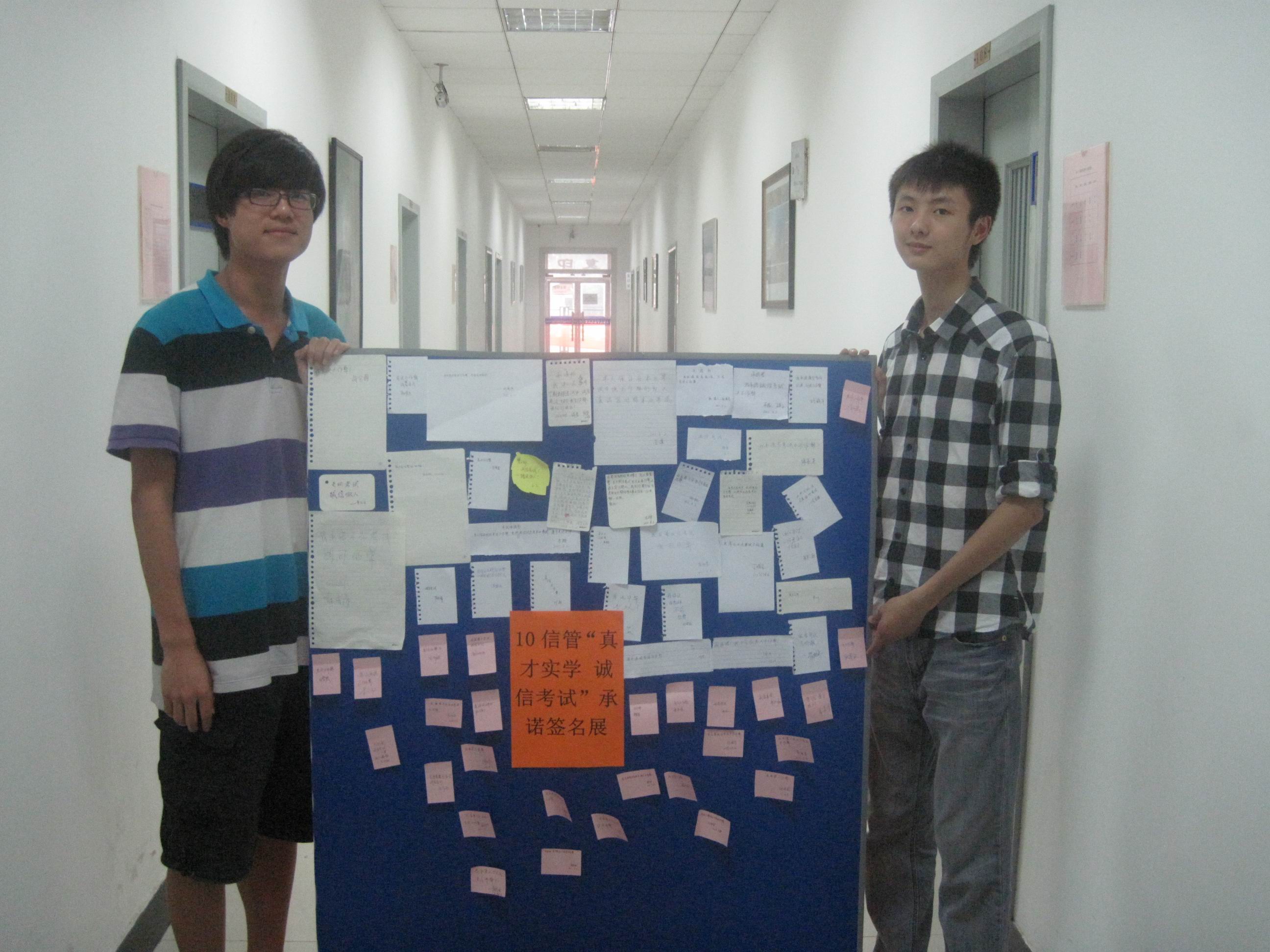 为迎接即将到来的春季学期考试周,应团委号召,树道德新风,维护良好的学风和考风, 2010级信息管理与信息系统专业近期召开了"真才实学,诚信考试"的主题活动。 5月31日, 10级信息管理与信息系统专业召开了主题班会。班会上辅导员颜丽娜老师提醒大家要及早复习,认真备考。她特别强调了诚信考试的重要性,她说诚信是传统美德,也是青年大学生的道德和纪律要求,同学们要用自己的真才实学,诚信应考。她还讲述了活生生的考试违纪和作弊的事例以及带给学生的影响,告诫大家不能存有侥幸心理,以免一失足成千古恨。 班会后,班委带领大家对学习了《学生手册》的相关内容,并组织同学开展了诚信承诺签名活动──同学们将自己诚信考试的承诺写出来,并郑重地签上了自己的名字。"诚信考试,踏实做人","我郑重承诺,坚决远离作弊,抵制作弊行为","真汉子,不作弊","坚决以诚信的态度面对考试"……一张张贴在展板上的承诺,表达着信管专业学生诚信考试的决心。(学工部)