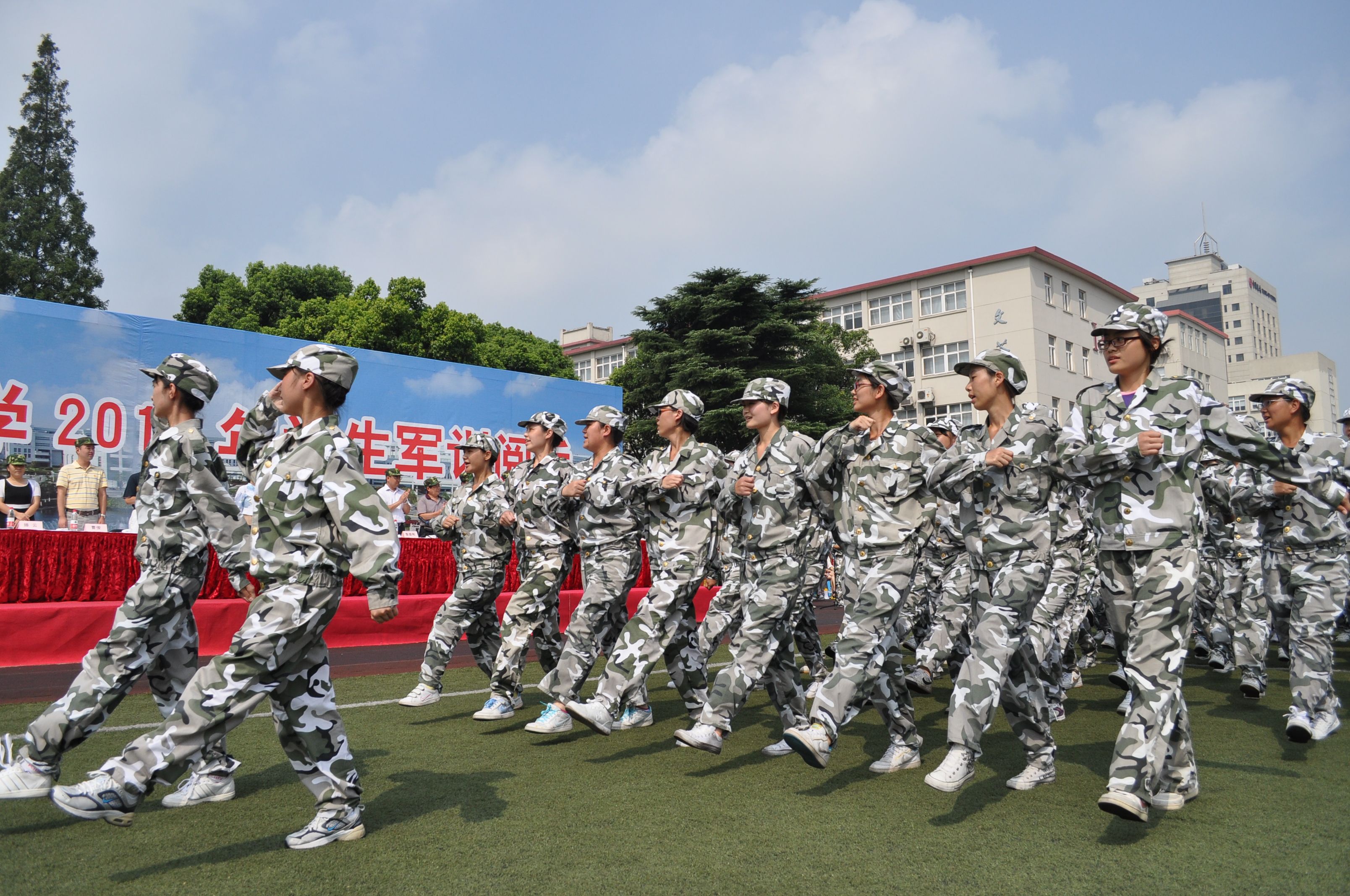 9时许,各连队的同学们顶着炎炎烈日,以饱满的精神面貌,接受了领导们的检阅。检阅结束后,阅兵式正式开始。一连和二连的热血男儿喊着激情澎湃的番号声走过了主席台前方,三连和四连的姑娘们巾帼不让须眉,整齐的步伐,高昂的斗志,嘹亮的口号赢得了阵阵掌声。接下来的汇报表演中,同学们相继表演了队列操、男子拳术、女子擒拿与反擒拿。大家斗志昂扬,呼声嘹亮,充分展示了军训的丰硕成果。
