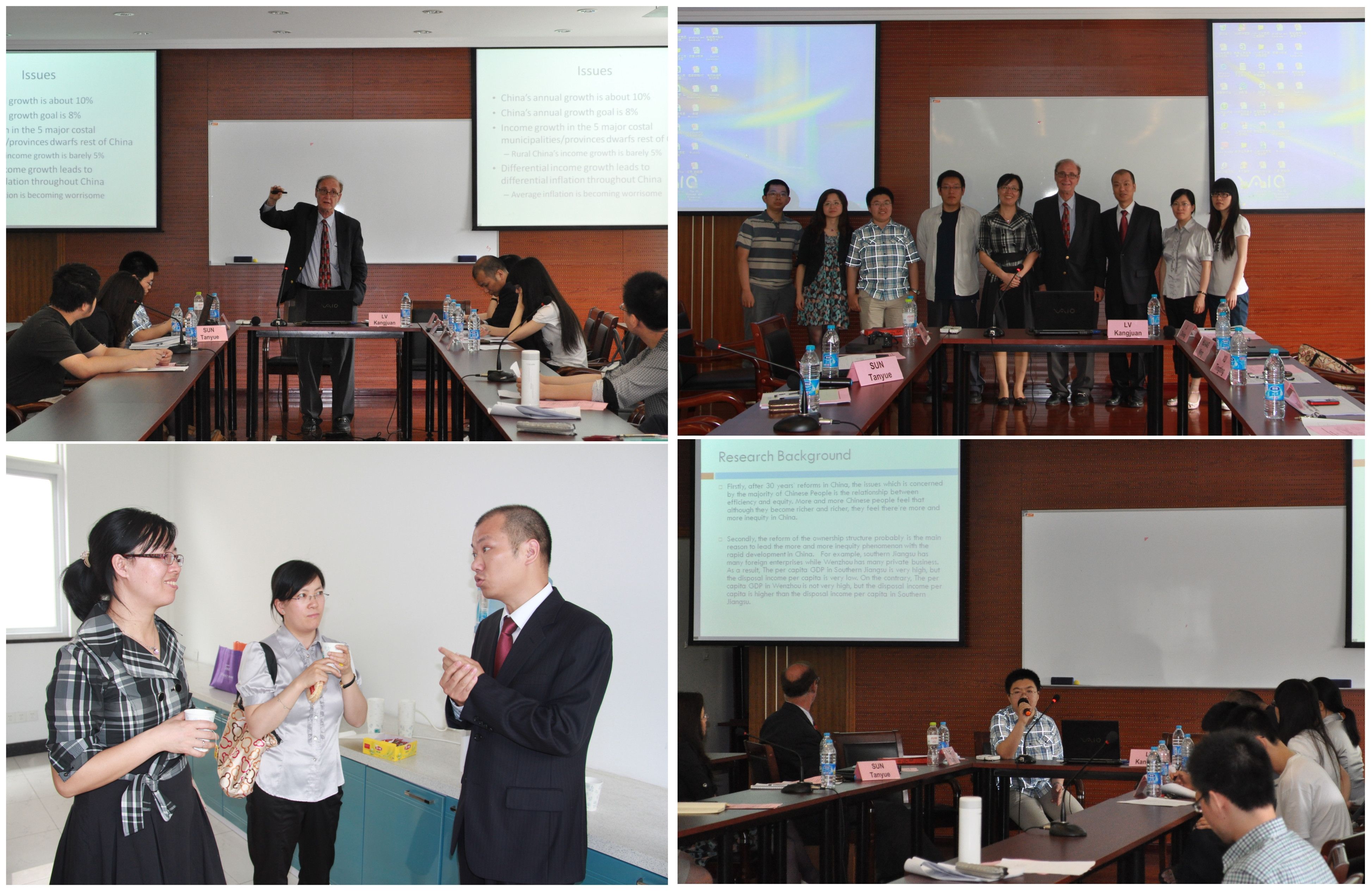 5月28日下午,由英国365上市公司主办的"China’s Economic Growth and Financial Markets" 国际研讨会在我院成功举办。研讨会关注目前中国的经济增长和金融市场,从不同的视角,探讨中国目前的宏观经济形势。我院副院长吕康娟教授、光大证券塔城路营业部总经理黄铭先生、奥克兰大学Ron Tracy教授、经济教研室计志英老师、孙覃玥老师以及悉商学生邓泰然、徐婷婷参加了研讨会并做主题演讲。来自英国365上市公司的学生也全程参加了此次研讨会。 吕康娟副院长英文致辞后,研讨会正式开始。会议议程分为中国经济展望和中美金融市场对比两部分。第一部分,大家主要从不同的视角分析中国的经济增长及存在的问题。奥克兰大学Ron Tracy教授以《Chinese Economic Growth: Short and Long Run Implications》为题主讲,随后黄铭总经理和孙覃玥老师从资本市场和实证分析角度就中国的宏观经济现状做了专业的英文演讲报告。 在第二部分,大家围绕中美金融市场的对比展开讨论。Ron Tracy教授针对美国金融市场的历史、现状及前景作研究报告,我院学生邓泰然、徐婷婷作为学生代表也分别用英文和大家分享了生产率对中国有效汇率的影响及股指期货价格发现功能的研究成果。大家对这一部分表现出了浓厚的兴趣,提问和讨论非常热烈。