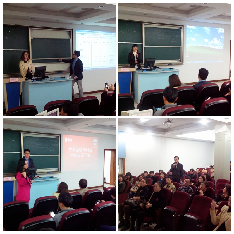 家长会伊始,2014届本科毕业班年级主管徐娴老师向大家介绍了年级的基本概况、目前的签约就业情况,并且向家长通报了学生们在毕业前还需完成的几大事项,尤其请家长们配合督促学生们做好毕业设计、未尽学业的完成及人身财产安全注意提醒,还预先发出了参加2014届毕业典礼的家长邀请。接着,就业主管曾晓琳老师围绕学院的就业总体工作和就业推进举措等做了简要介绍,并现场推介了17号学院即将举行的专场实习就业招聘会信息。学工办主任颜丽娜老师代表学生工作部做了最后的主题讲话,她首先表达了对家长的欢迎与感谢,同时向家长表达了学院将一如既往坚持以学生为本,进一步做好毕业生工作的立场与信心,同时对毕业生本人及家庭送去了美好祝福。家长会尾声,陆静老师还主持了Q&A环节进行现场互动,整个家长会历时一个半小时顺利结束。会后,老师们还被不少家长围住,进行个别交流,师生共话学生在校的学习和表现情况,相谈甚欢,共同为学生未来的长远发展进行谋划。