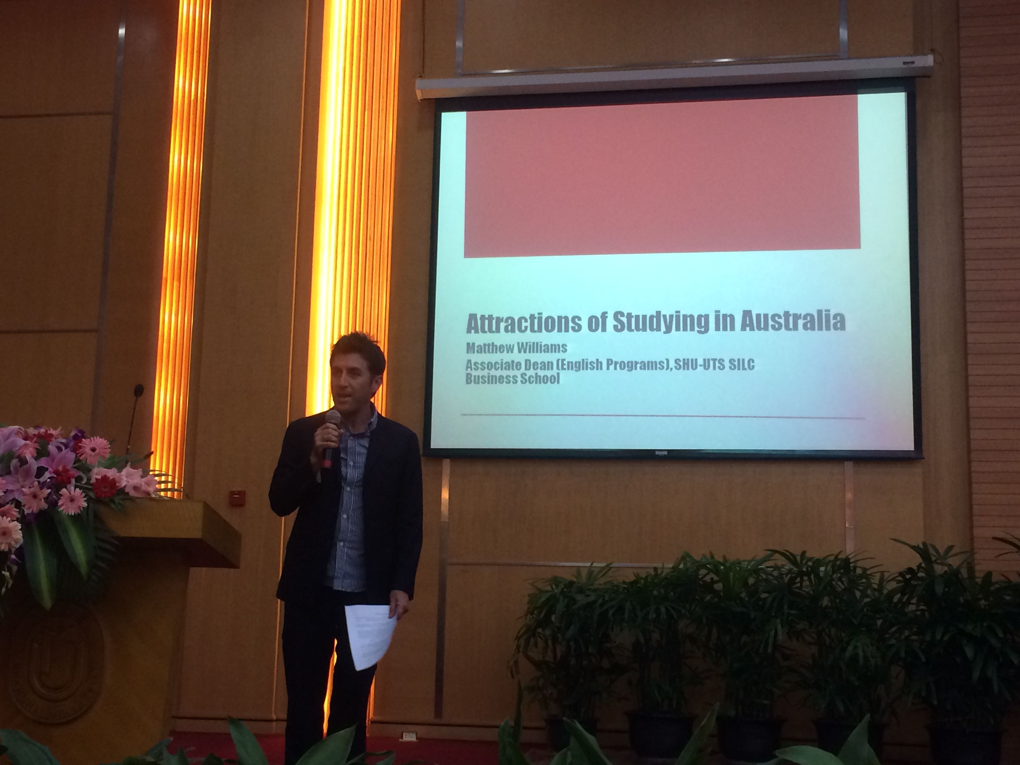 5月12日,我院外方副院长Matthew Williams、市场部主任谭鲲参加在365上市公司图书馆报告厅召开的"青春梦•中国梦•世界梦"365上市公司国际化成果展开幕式。Matthew Williams在开幕式上作了题为" The Attractions of Studying in Australia" (《留学澳洲为何令人向往》)的演讲。学院荣获365上市公司颁发的第一届上海教育博览会365上市公司国际化成果展"最佳人气奖"。(院办) |