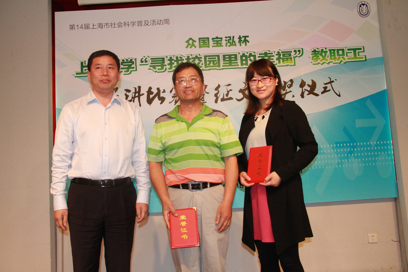 2015年6月18日下午,在宝山校区行政楼报告厅举行了"寻找校园里的幸福"演讲比赛暨征文颁奖活动。我院姜爱萍老师代表学院参与了校级比赛,姜老师声情并茂地讲述了她与学生的事故,激情高昂的语言诠释着教师职业的幸福,表达了教师心系教育、情系学生无私的爱与幸福感!给在座评委和现场观众留下了深刻印象。