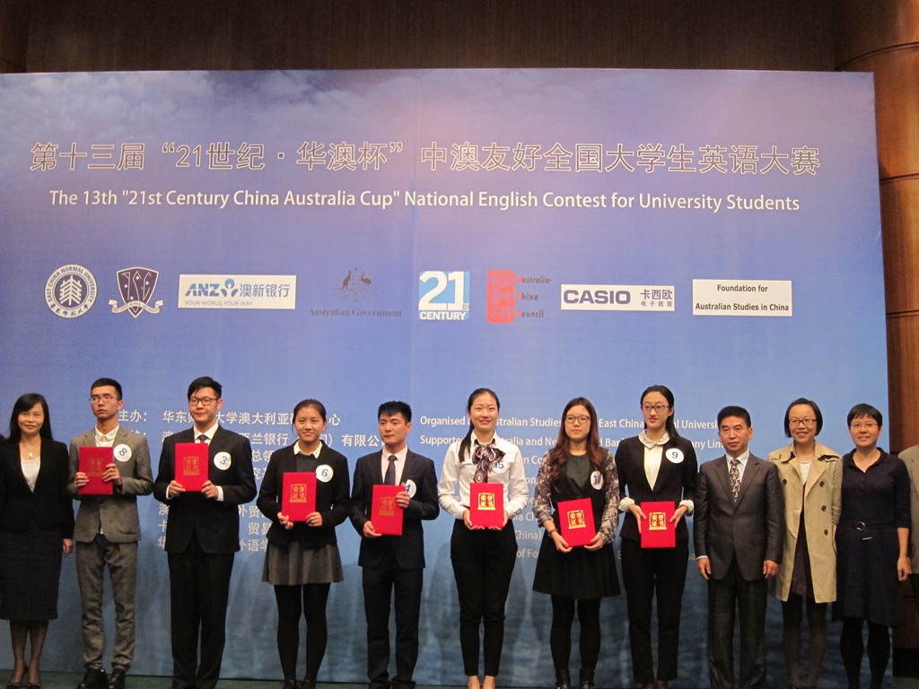 11月1日下午,第十三届"21世纪·华澳杯"中澳友好全国大学生英语大赛在华东师范大学中山北路校区的逸夫楼报告厅举行。决赛选手来自全国22所高校,7位评委包括上海外国语大学外语学科学术委员会主任、澳新银行集团的区域首席运营官、澳大利亚驻沪总领事馆高级行政助理、中国日报上海分社副总编辑等语言专家及重要的澳洲机构代表。