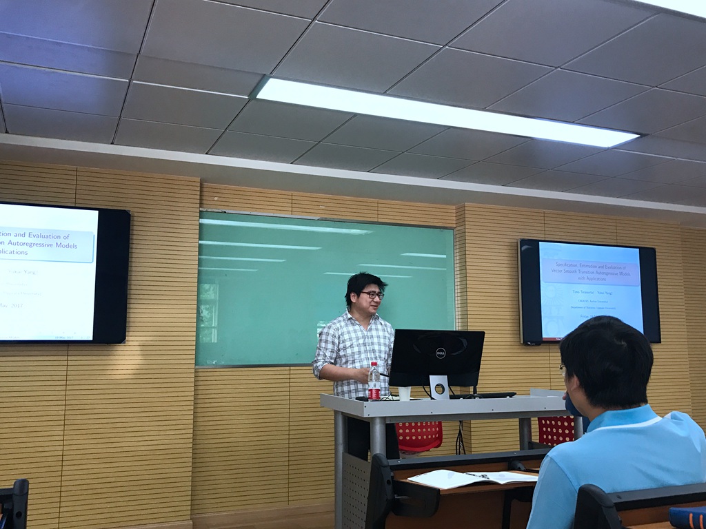 5月19日,瑞典乌普萨拉高级讲师杨遇凯博士应邀来我院开设讲座,讲座题为《Specification, Estimation and Evaluation of Vector Smooth Transition Autoregressive Models with Applications》。杨博士介绍了一种称为对数向量平滑过渡自回归模型的非线性向量模型,包括模型的原理与方法。杨博士还运用两个具体案例展现了该模型的应用方法:第一,杨博士及其团队研究了美国汽油价格与消费之间的动态关系,并考虑了其可能的不对称性。第二个应用包括建立了两个众所周知的冰岛河流系列,这个问题受到许多水文学家和时间序列分析人员的关注与探讨。