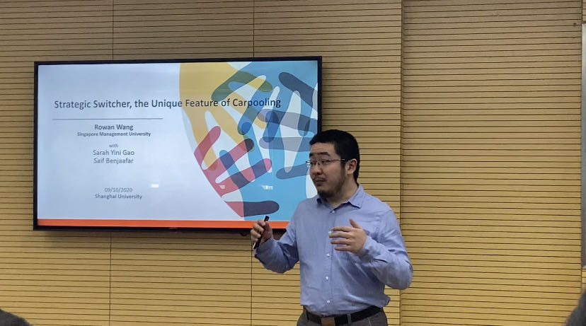 王宇博士就其对于顺风车商业模式的思考进行了主题为“Strategic Switcher, the Unique Feature of Carpooling“的讲座。他列举了当今几种私人陆地出行的方式,引出顺风车模式区别于二者的特征:顺风车产生订单不是源于司机为了寻找收入,出行的目的地也是司机决定,司机和乘客共同商议决定是否产生订单。尽管顺风车并没有采取动态定价的模式,但其在高峰时期对于需求和供给端的匹配问题并没有展现出弱势,即并没有出现在高峰时期漫长的等车现象,反而解决了匹配失衡的问题。原因在于部分顺风车使用者可以在需求端和供给端灵活转变,从而自动解决了需求供给匹配失衡的问题,并引入”strategic switcher”的概念描述这类人群,影响这类人群转变角色的原因有二,一是作为供给端的收入,而是作为需求端的等待时间。之后,王宇博士通过对于顺风车系统进行建模,其中包含三类人群:”pure rider”,”pure driver” 和”strategic switcher”,找到了最优的”strategic switcher“的数量,以使得需求端和供给端达到最好匹配。