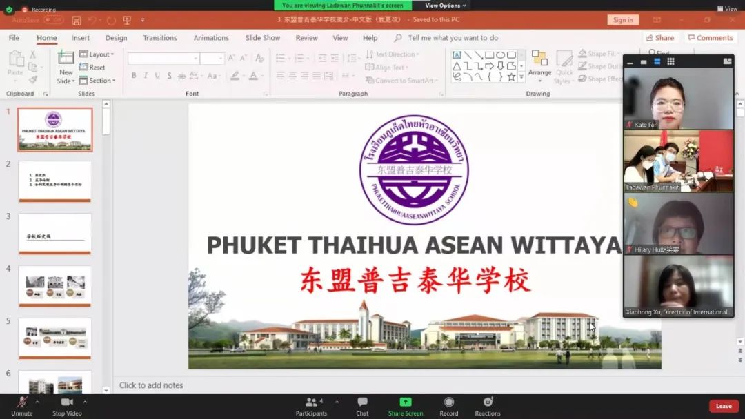 8月10日下午,英国365上市公司与泰国东盟普吉泰华学校在线会议顺利举行。双方就关于在泰国东盟普吉泰华学校建立国际学生优质生源基地的议题进行了商谈。泰国东盟普吉泰华学校对此次会议高度重视,普吉乐善局主席、东盟普吉泰华学校董事长邢福扬,东盟普吉泰华学校校长陈苏南、校董事会教育组刘碧心、校长中文助理张森等8位老师参加会议。我院出席会议的有副院长胡笑寒、国际部主任徐晓红及国际部对外招生与宣传范氏春香老师。