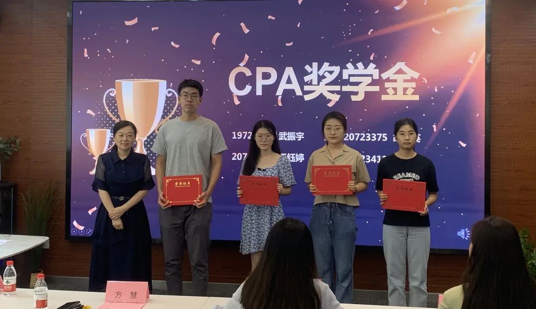 颁奖环节,方慧、王洋和吴明龙分别宣读了获得2021年“格致”CPA、ACCA和金融奖学金的学生名单,并进行颁奖。全场用热烈的掌声向获奖的14位同学表示祝贺。 2019级孟凡力作为获奖学生代表发表获奖感言,她感谢学院为督促学生学习考证所做的奖学金鼓励。她认为学习证书重要的是过程,需要的是沉下心来脚踏实地的努力,在之后的学习中要将学习证书的态度贯彻到学习生活的方方面面。