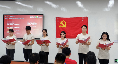 大家共同观看了“悉商研究生献礼建党100周年成果展示”视频,回顾学院上半年庆祝建党百年系列活动,为学院取得的累累硕果感到骄傲和自豪。凝聚力量,薪火相传。研究生第二党总支书记、党建中心副主任陈卓作为党员代表发言。她说,在全体研究生党员一学年的辛勤付出和努力下,学院成功组织了一系列丰富多彩的党日活动,不断创新党建形式,营造了良好的组织氛围;组建首届学院研究生“红色学讲团”,学讲团成员多次前往基层讲学党课,取得了显著的成效。新学期伊始,新鲜党员血液为学院党建工作增添了新的生机,她希望大家能够进一步提高政治素养和思想认识,做党的路线、方针、政策的学习者、宣传者;同时,自己也将进一步明确自身职责,不断发挥党员的先锋模范作用。不忘初心,牢记使命。陈卓同志带领全场党员重温入党誓词,希望每位党员同志端正入党动机,争做有理想、有本领、有担当的时代新青年。青年是党和国家的未来和希望。新一代青年必将继承先辈们的铁血与荣光,迈向发展的新征程。建党百年之际,蒋明珠等六位新生带来了诗朗诵《请党放心,强国有我》,全体党员也跟随着领诵同学一起宣誓。全体党员们歌颂人民英雄的荣光,向党致以青春的礼赞,高喊“请党放心,强国有我”。这是青春的誓言,我们必将不忘初心,勇挑重担;这是青春的承诺,我们都是追梦人,志在千秋,人民就是江山!