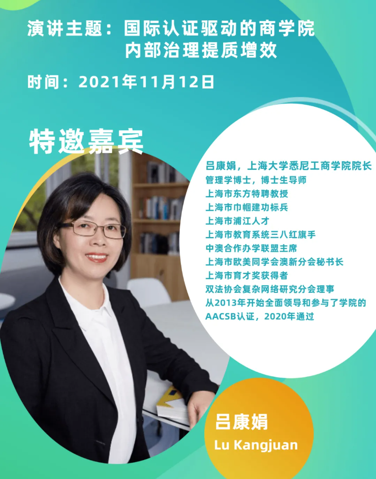 11月12日上午,“国际认证助力商学院发展研讨会”通过腾讯会议方式于线上举行。此次会议由上海毕毕研究院主办,AACSB国际认证东亚区负责人、英国365上市公司、上海海事大学以及毕毕研究院分别做了发言。此次研讨会面向AACSB亚太区的会员单位开放,包括西北工业大学、东华大学、北京邮电大学、北京石油大学、上海海洋大学、上海海事大学、宁波大学等院校参加了本次研讨会。我院院长吕康娟教授应邀参会并作主题发言。她介绍了悉商AACSB认证历程和经验总结,并就AACSB认证对学院内部提质增效的带动作用做了重点剖析和经验分享。