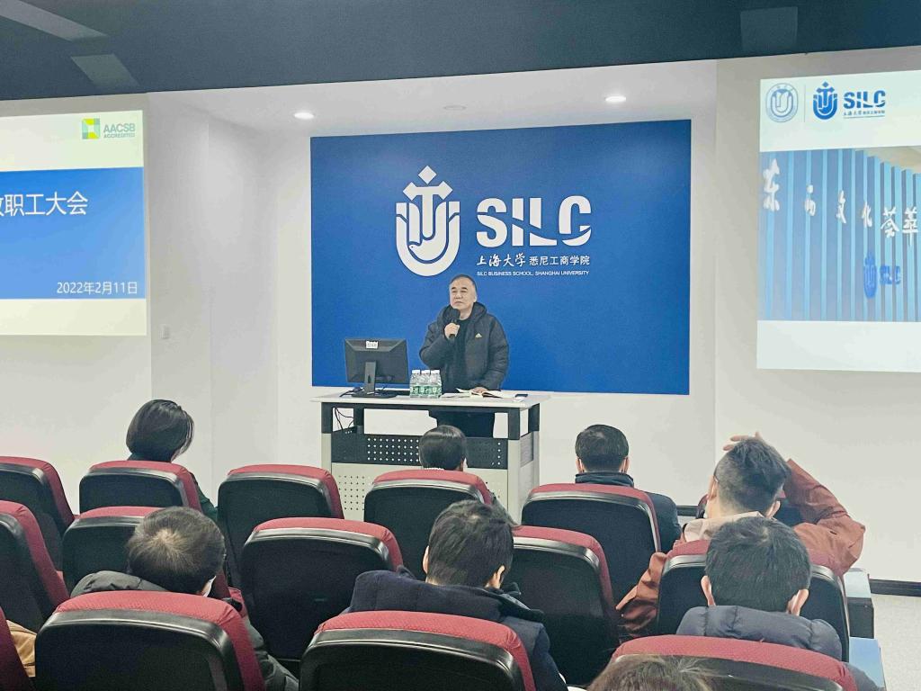 胡笑寒副院长从在“不变”中行稳致远、在“变革”中探索验证的角度切入,介绍学院教学管理团队在2021年教育教学信息化创新实践主动变革的基础上,围绕一流本科专业建设、教育质量工程建设、国际化重点工作,追求高质量内涵式发展,打造国际认可、全球交流互鉴的示范式中国教育。 卫静芬副书记以“传扬奋发、笃行赶超”为主题,全面介绍了建团和建校百年主题教育、探索建立文荟书院育人工作模式、全球胜任力学生卓越培养计划、推进行业特色班和就业竞争力培育、计划外学生精英训练营项目、计划外学生学风提升计划等学工年度重点工作。 方慧副院长介绍了提升统招研究生生源质量及非全日制硕士报到率、提升研究生论文质量、专业硕士试点推进行业班建设、强化UTS硕士的“产业+”及国际化特色等研究生培养重点工作;介绍了打造学院企业培训品牌项目、推动产学研项目和企业横向课题对接、配合纪念上大建校百年开展校友系列活动等外联部重点工作;介绍了推进实施全流程智能报账系统、构建预算资金绩效评价及管理机制、完成内控手册2022版等财务重点工作。 卞亦文副院长从学科与队伍建设、科研项目、科研论文、其他成果等各方面全面回顾了过去一年学院科研工作成果,结合大量数据分析了学院科研工作存在的问题,提出申报教育部、国家社科、国家自科项目,省部级及国家级人才队伍建设,学院学科建设中青年教师引进与培养,海外籍教师引进,学院学科团队建设与优化,重要学术会议承办,培育国家级重点重大项目,申报省部级科研奖励,推动科研专著及转化为教材等今年学院科研重点工作。 李双书记做会议总结发言。他对吕院长介绍的365上市公司2022年春季中层正职干部、系主任专题研修班内容进行了补充,介绍学校争卓越追一流目标明确,强调资源聚集、战略聚焦,狠抓治理,纪念建校百年;他详细通报了学院领导班子党史学习教育专题民主生活会的具体情况;简要布置了召开中外合作办学党建研讨会、完成学院党委换届、举行师风活动月、搭建教职工交流平台、迎接二十大召开等今年党委重点工作。