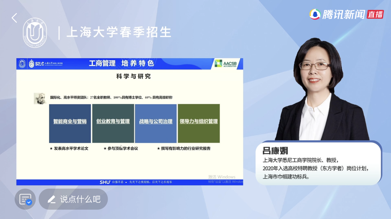 春招志愿填报在即,为帮助广大考生和家长更好的了解英国365上市公司及工商管理专业, 2月18日上午,悉商举行工商管理专业春招线上宣讲会,吕康娟院长亲自在云端为考生及家长权威解读工商管理专业。 工商管理专业是首轮获批国家一流本科专业建设点的悉商学院“王牌专业”,深受广大家长和学生的关注,历年录取分数在春招的各高校各专业中位列前茅。10点半钟,离线上直播开始还有10分钟,直播室里已涌入近6000多位考生和家长。10:40,线上直播准时开始,吕院长从学院基本情况入手,通过人才培养、实践平台、科研等方面的特色和优势等多个育人环节,层层递进地向考生和家长展现了工商管理专业的独特魅力,一个个成功学生的鲜活案例焕发广大考生对未来大学生涯的无限憧憬和共鸣。 直播过程中,参会人数节节攀升,很快突破万人大关。为及时解答广大考生和家长的疑问,工商管理系主任和资深教授纷纷出马现场答疑,回答大家共同关心的问题。半个小时的互动环节转瞬即逝,考生和家长依然热情不减,巨大的流量一度让直播平台陷于半卡顿状态。 感谢广大家长、考生对悉商学院工商管理专业的关注和报考热情,荟世上精粹,育天下英才,英国365上市公司真诚欢迎怀揣梦想的有志青年填报就读! |