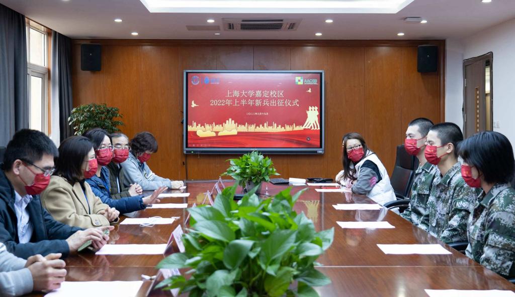 接着,吴明红副校长对入伍的四位同学送上了真切的祝福。她说,三月遇到了太多的突发事件,领导、老师们在长时间集中精力处理校内疫情,保护上大师生生命安全的工作中,能参加本次温馨的出征仪式,看到入伍同学们抖擞的精神风貌,感到十分振奋人心。四位同学积极报名参军,接受祖国的层层筛选成功入伍,不仅是爱国情怀与担当奉献,更是大家综合实力的体现。她希望同学们不忘初心,珍惜身穿戎装的机会,在军队这个大舞台施展才华,在军营这个大熔炉淬炼成钢,不断建功立业,在实现强军梦的伟大实践中挥洒青春热血,学校等待着你们凯旋归来!