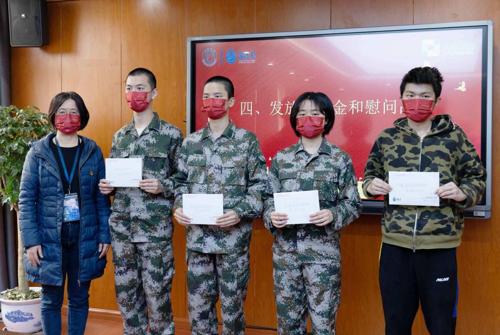 仪式临近尾声,吕康娟院长向参军入伍的四名同学发放了慰问金,郭纯生主任向他们颁发了慰问品,辅导员们也向各自的学生赠送了亲手书写的纪念明信片,附上美好的祝愿。最后大家合影留念。