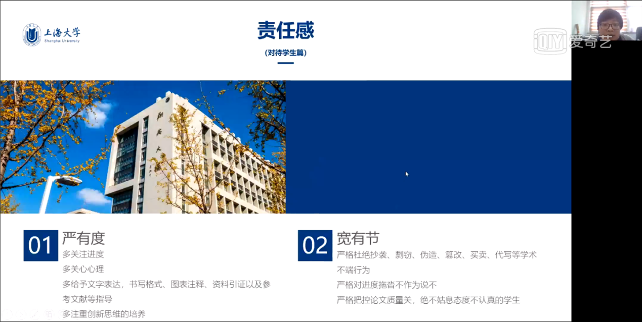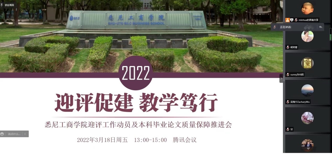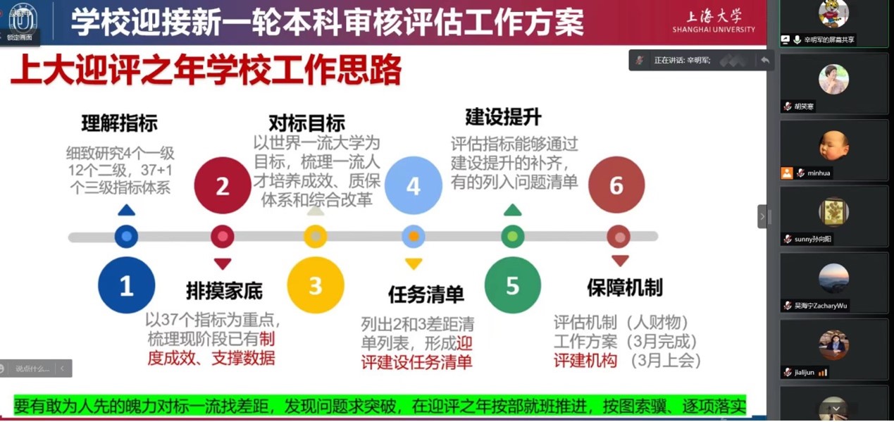 辛明军主任首先介绍了365上市公司迎接新一轮本科审核评估工作的整体方案,从理解指标、排摸家底、对标目标到制定任务清单、建设提升、形成保障机制,基于学校的整体工作思路,提出了院系可推行的工作重点,即从培养过程、教学资源与利用、师资队伍、学生发展、质量保障这五大板块制定建设计划或工作推进方案,制定好自评的时间节点,完成自评报告。辛老师着重就春季学期的本科毕业设计工作进行介绍,从教育部、上海市对高校本科毕业设计的要求到学校对本科毕业设计的保障制度、质量要求都进行了讲解,并且以2021年本科毕业论文抽检中发生的具体实例,对一些共性问题做了具体分析;通过对2021年本科毕业论文工作的整体回顾分享了毕业论文工作推进和保障过程中的一些经验,给老师们的毕业论文指导工作提供借鉴。