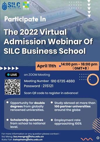 受疫情影响,国际部招生团队无法赴境外与学生面对面交流,但招生宣传脚步不停,接下来将在“云端”组织、参与各类国际教育展及宣讲会。 Upcoming Events 1.4月11日 The 2022 Virtual Admission Webinar of SILC Business School 2022 Virtual Admission Webinar是我院国际部首次组织的、面向海内外高校和中学管理者、学业发展顾问、招生机构、生源基地、国际学生的线上展会。届时,我们将邀请学院领导、各专业系、和在校优秀国际学生代表共同参与,向全球同行和国际学生展示我院的优质师资、项目、和国际化学习环境等。