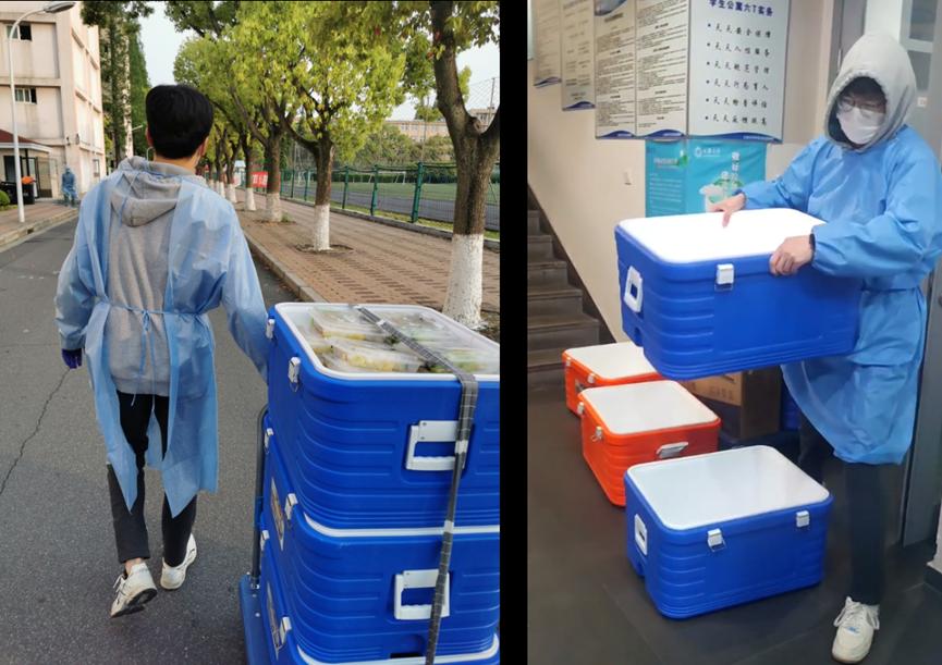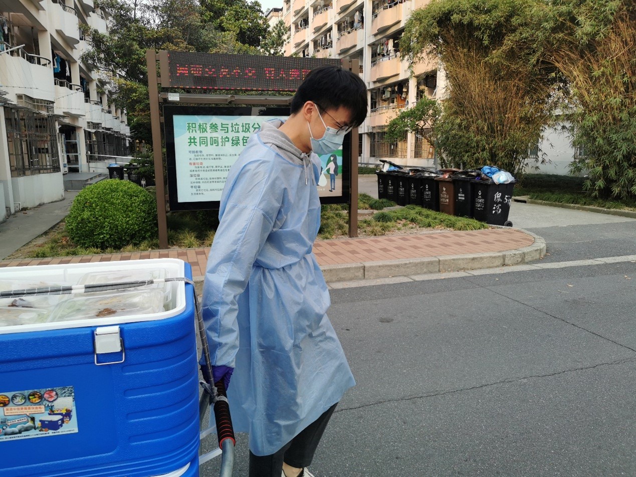 在校区封闭管理期间,一批研究生骨干担任社区网格化管理小组长,参与多项志愿活动:维护核酸检测的现场秩序、帮助同学搬运行李、发放防疫物资、维护食堂秩序、配送早餐、担任校园“Tony”为同学们理发……哪里有需要,哪里就有他们的身影!2020级企业管理专业研究生毛浩楠,是这支研究生青年骨干突击队中的光荣一兵。 一、忙碌的一天从清晨开始 毛浩楠是校区5号宿舍楼的一名层长。前段时间校区实行“足不出寝”管理政策,同学们的一天三餐需要各宿舍楼统一取餐分发。毛浩楠主动担起了责任,每天一大早就和其它学生骨干一起,去食堂为宿舍数百位同学领回早餐。早餐领回宿舍后,毛浩楠同学和其他志愿者一起,根据各楼层人数将早餐分好,并把自己负责楼层的早餐搬上楼,交到各个宿舍网格组长手中。确保负责楼层的每一位同学都领到早餐之后,毛浩楠才有空吃早饭。