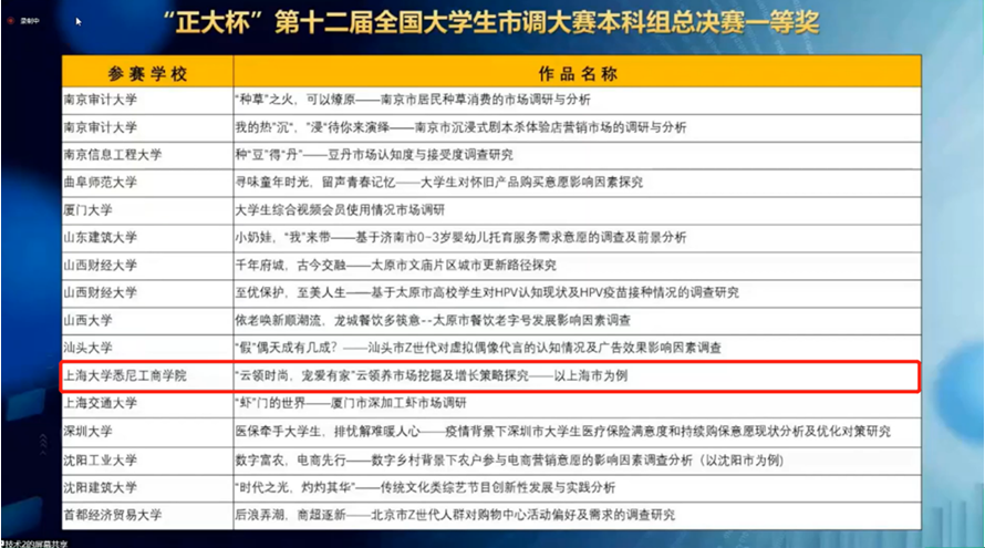 5月28至29日,中国商业统计学会主办的“正大杯”第十二届全国大学生市场调查与分析大赛本科组赛在江汉大学举行。我院姜爱萍老师指导的学生代表队荣获一等奖。 本届大赛于2021年9月启动,全国共有815所高校,近18万名大学生报名参赛,其中报名参加本科组赛的高校有708所,参赛学生14.6万人。历经7个月时间,学生们积极深入基层和企业,将理论知识与社会课堂相结合,经过层层选拔、积极备赛,最终有126所高校的211支团队,1014名参赛学生入围本科组的全国总决赛。 我院姜爱萍老师指导的本科组团队以作品《“云领时尚,宠爱有家”云领养市场挖掘及增长策略探究——以上海市为例》荣获全国一等奖。团队成员表示,老师的悉心指导对作品打磨和进步至关重要,通过此次大赛不仅充分锻炼了数据洞察与分析能力,同时培养了团队实践精神。