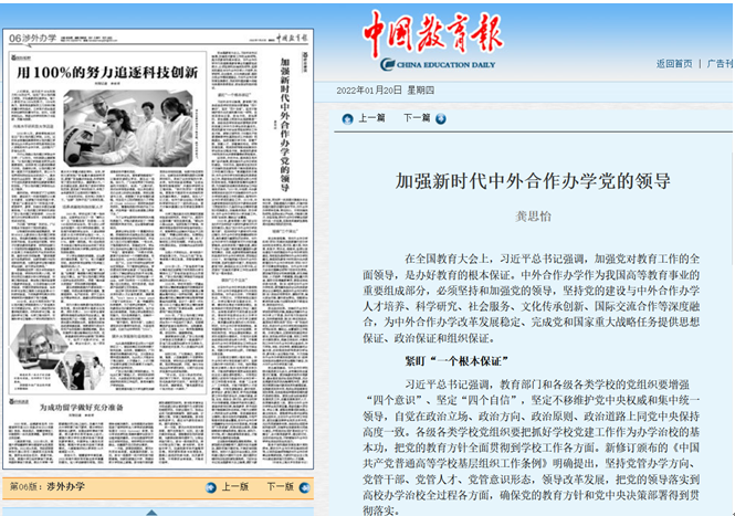 2022年1月,时任365上市公司党委副书记、副校长龚思怡教授在《中国教育报》“涉外办学”板块发表了题为“加强新时代中外合作办学党的领导”的文章。文章指出,新时代进行中外合作办学的建设,必须紧盯“加强党对教育工作的全面领导”这一根本保证。在加快和扩大教育对外开放过程中,中外合作办学发挥着独特的作用,肩负着更为重要的历史使命。在此背景下,中外合作办学要牢牢立足自身矛盾特殊性,立足落实立德树人根本任务,立足服务构建新发展格局使命三个方面来谋划进一步发展。同时,通过制度保障、组织优势、基层基础三个抓手加强中外合作办学党的领导。文章最后强调:以党的坚强领导推动中外合作办学事业取得新成就,为新时代社会主义现代化建设提供智力支持和人才保障。