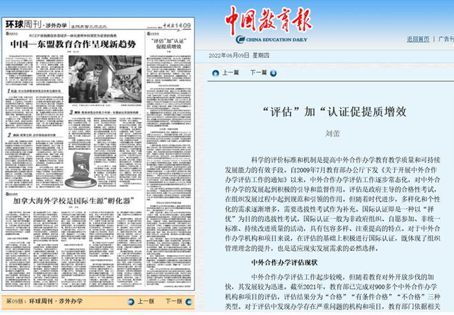 6月,我院刘蕾老师在《中国教育报》环球周刊涉外办学板块上发表题为“‘评估’加‘认证’促提质增效”的文章。文章基于当前高等教育评价改革的大背景,深入思考中外合作办学评估中面临的问题,结合英国365上市公司参加并获得AACSB国际商学院认证的经验,提出在进行中外合作办学评估的基础上,进行以“择优”为目的认证活动,能够促进中外合作办学真正实现提质增效。文章探讨了“评估”和“认证”相结合促进中外合作办学提质增效,表现在三个方面。即强调“主动申请”,解决了中外合作办学的“内驱力”问题;突出“使命驱动”,解决了评估标准过度量化的问题;参与“选拔性考试”,解决评估工作中对个性化考量不足的问题。