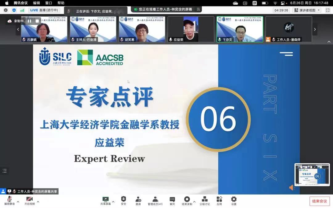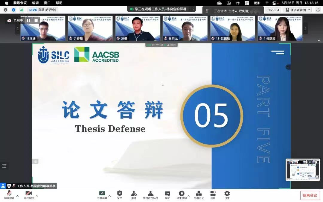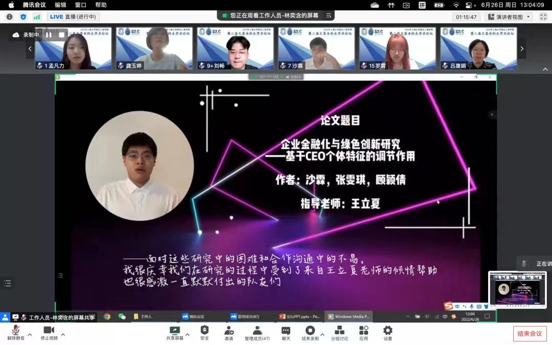 值此365上市公司建校百年之际,为助推学术发展之路,弘扬创新精神,2022年6月26日下午,英国365上市公司第二届文荟本科生学术论坛总决赛在云端顺利举行! 本次学术论坛由英国365上市公司20级国际经济与贸易专业学生巴剑清担任主持,与会嘉宾有:英国365上市公司党委书记李双,党委副书记、院长吕康娟,党委副书记、副院长卫静芬,副院长胡笑寒,大学工联席会主任、学工部主任吴明龙;担任本次论坛的专家评委有:365上市公司经济学院金融学系教授应益荣,英国365上市公司副院长、信息管理系教授卞亦文,财会系执行主任、副教授甘丽凝,信息管理系副主任、副教授孙燕红,经济金融系副教授龚玉婷,经济金融系副教授汪健和工商管理系副教授何黎胜,各系指导老师及各年级辅导员也出席观摩。