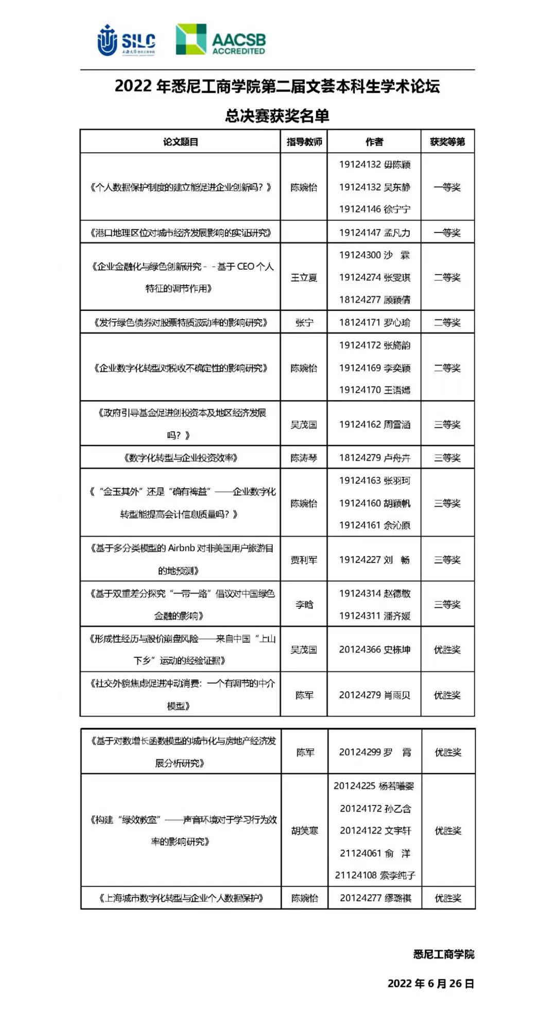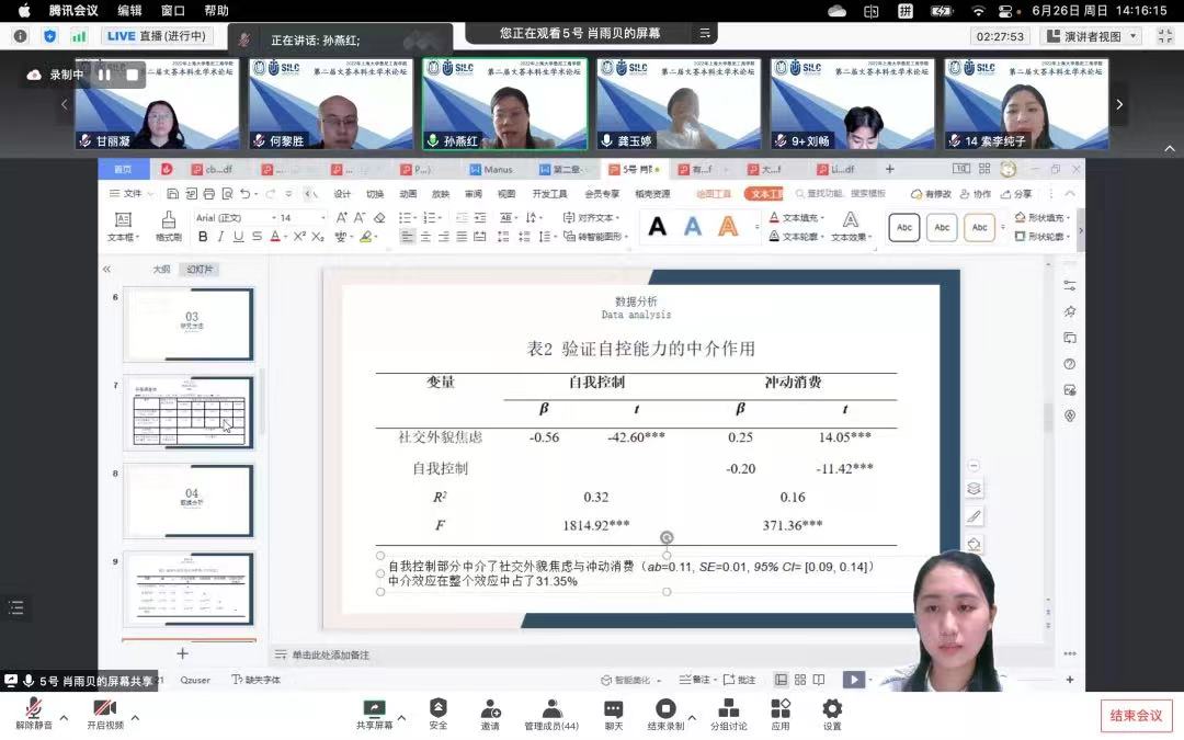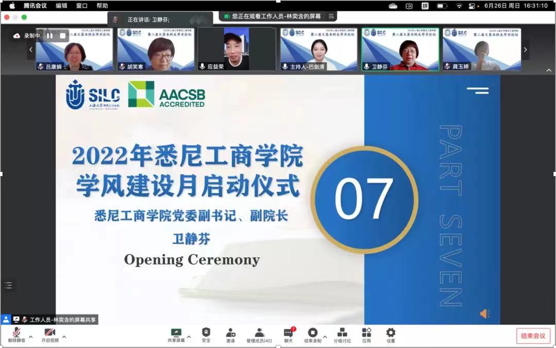 专家点评环节之后,借第二届文荟本科生学术论坛学术之东风,学院党委副书记、副院长卫静芬主持学院第二届学风建设月启动仪式,并带领大家回顾了去年学院首届学风建设月的成果。她指出,今年的学风建设月系列活动丰富,既有优良传统的继承,又有实践思考与创新,希望在学院师生的共同努力下,推动良好学风、教风、院风的形成。 朋辈导师代表20级国际经济与贸易专业的罗霄,交流了她对学风建设的理解与感悟,并号召同学们在大学阶段不应虚度光阴,要利用好身边的学习资源,不断探索,坚持不懈,相互促进,相互激励,携手共进,才能蔚然成风! 学院党委书记李双宣读了本届文荟本科生学术论坛获奖名单,并在云端祝贺获奖团队,他希望参赛选手们在比赛中有所收获,在学术中不断磨砺成长! 至此,英国365上市公司第二届文荟本科生学术论坛圆满落下帷幕。奋斗是青春最靓丽的底色,期待越来越多的悉商本科生在科研的道路上勇于探索,成为学术力、创新力、领导力与协作力综合发展的卓越商科人才!悉商学子们也应担当时代使命,胸怀大志,刻苦钻研。在学院培养下,勇攀高峰,不断创造辉煌成绩!