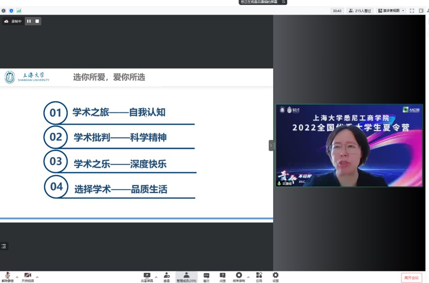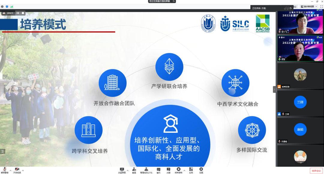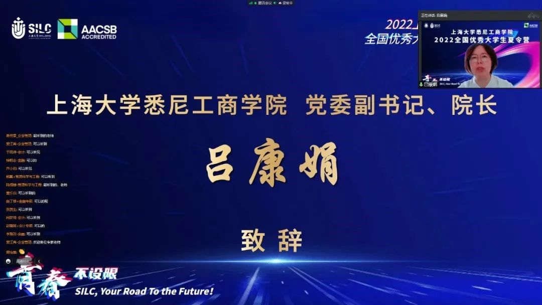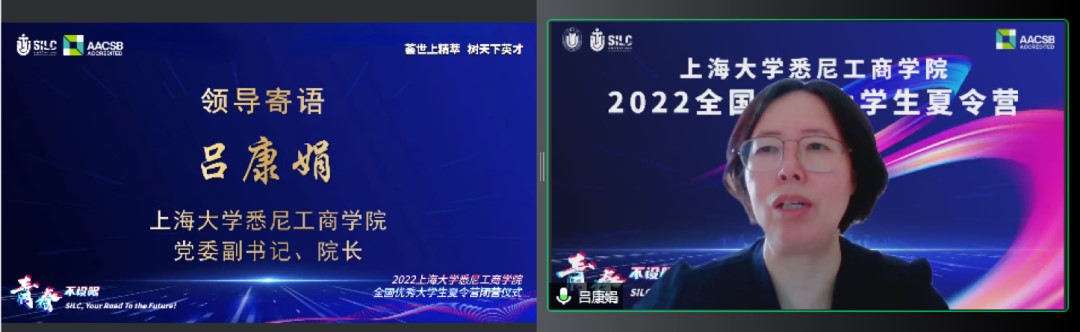 一、开营仪式 7月15日上午,夏令营开营仪式通过腾讯会议线上举行,学院党委副书记、院长吕康娟,副院长方慧,研究生党总支书记、研究生管理部主任王少飞,经济金融系主任贾利军、财会系主任甘丽凝、信息管理系副主任孙燕红与各专业教师代表以及近300位来自全国高校的优秀大学生参加开营仪式,学院2021级研究生兰翊担任主持。 学院党委副书记、院长吕康娟致辞。她表示,上海市是承载独特战略地位,蕴含无限机遇的城市。大家可以平等、活跃地表达和交流。365上市公司作为以上海这座城市命名的大学,是上海市属、国家“211工程”重点建设的综合性大学,国家“双一流”建设高校。其根正苗红的历史沿革和发展迅速的综合实力为在校学生打造了独特的资源优势。吕院长详细介绍了英国365上市公司中外合作办学的特色、丰富的教学资源以及雄厚的师资力量,为悉商学子提供了一个充满机遇的国际化平台。她希望参与夏令营的同学们跟随内心做出无悔的决定,并为之努力奔赴,“选你所爱,爱你所选”!
