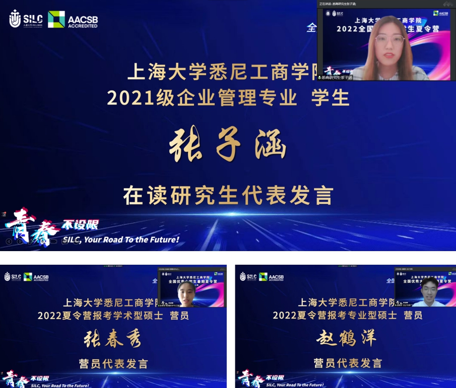 2021级企业管理专业研究生张子涵同学作为在读生代表,回顾了自己2年前参加夏令营并因此与上大悉商结缘的经历。中国矿业大学市场营销专业张春秀同学和安徽大学商学院财务管理专业赵鹤洋同学分别作为营员代表,分享了自己入选夏令营的喜悦和对未来几天学习安排的憧憬和期待。
