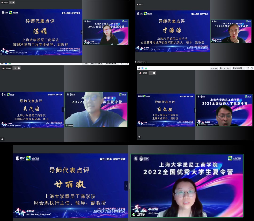 三、闭营仪式 7月17日下午,闭营仪式在线上举行,学院党委副书记、院长吕康娟,副院长方慧,研究生党总支书记、研究生管理部主任王少飞,学院各系老师和营员们参会。 营员代表梁永喆、周千馥、汤梓燊、邢楚放和郭婷婷同学依次分享了自己参与此次夏令营的感想和体会,表达了对英国365上市公司的感谢,与对未来加入悉商大家庭的期盼。 管理科学与工程专业硕导陈娟副教授,企业管理专业研究生项目负责人、硕导才源源副教授,区域经济学专业硕导吴茂国博士、金融专业硕导薛文骏副教授,财会系执行主任、硕导甘丽凝副教授分别对参与本次夏令营的营员的表现进行了总结与点评,老师们高度赞扬了营员们的专业素养和学习能力,同时针对同学们的表现提出了专业、具体的建议,希望同学们未来继续提升自己,不断进步。