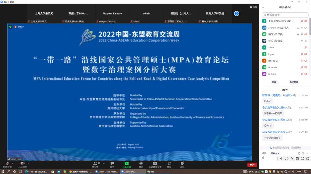 8月22日,中国—东盟教育交流周“‘一带一路’沿线国家公共管理硕士(MPA)教育论坛暨数字治理案例分析大赛” 在贵州举行。本次大赛由中国-东盟教育交流周组委会指导,贵州省行政管理学会支持,贵州财经大学主办。来自中国-东盟国家政界、学界、企业界200余人线上线下共同参与,贵州财经大学党委副书记杨勇教授担任主持。