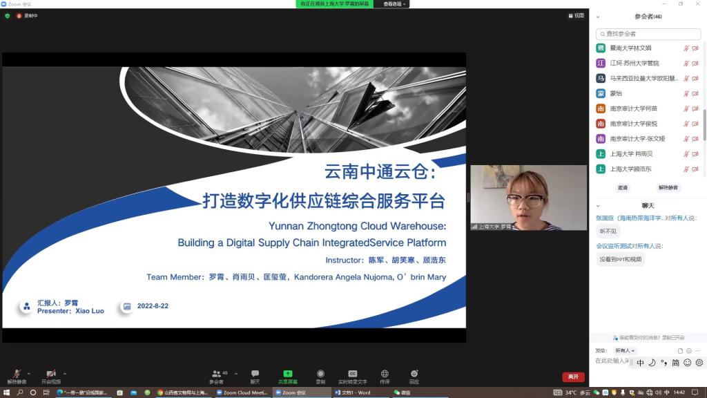 我院应邀参加论坛,派遣由肖贝雨、罗霄、匡玺萤、Bini Debordjo Marie O’brin、Kandorera Angela Nujoma等5位同学组成的中外学生联队参加数字治理大赛。陈军、胡笑寒、顾浩东等教师担任指导。罗霄同学代表365上市公司做题为“云南中通云仓:打造数字化供应链综合服务平台”的参赛汇报,从理论、趋势、优势、服务等方面做了详细的中英文阐释。在12支入围队伍中,365上市公司获得优秀奖。我院代表队项目选题得到评委会主席、湖南农业大学徐晓林教授的点名表扬。