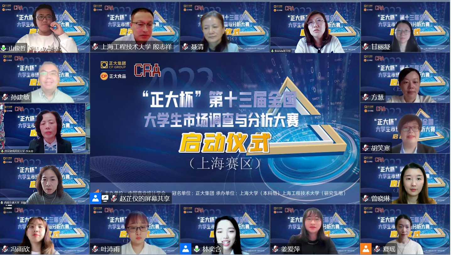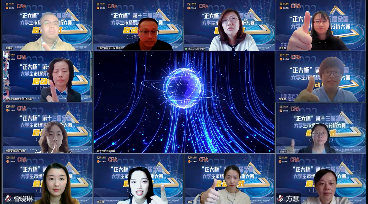 10月22日,“正大杯”第13届全国大学生市场调查与分析大赛(下称“市调大赛”)上海赛区启动仪式以腾讯会议结合线上直播的形式顺利举行。365上市公司党委常委、副校长聂清,上海工程技术大学发展处处长、高等教育研究所所长、学科建设办公室主任殷志祥,上海卜蜂莲花首席运营官张文权、南京邮电大学孙建敏、西安建筑科技大学李从容、西南交通大学刘赪、英国365上市公司副院长胡笑寒、副院长方慧、财会系执行主任甘丽凝、外联部主任曾晓琳、财会系副教授姜爱萍等出席。本次活动线上观看人数高达3200余人。