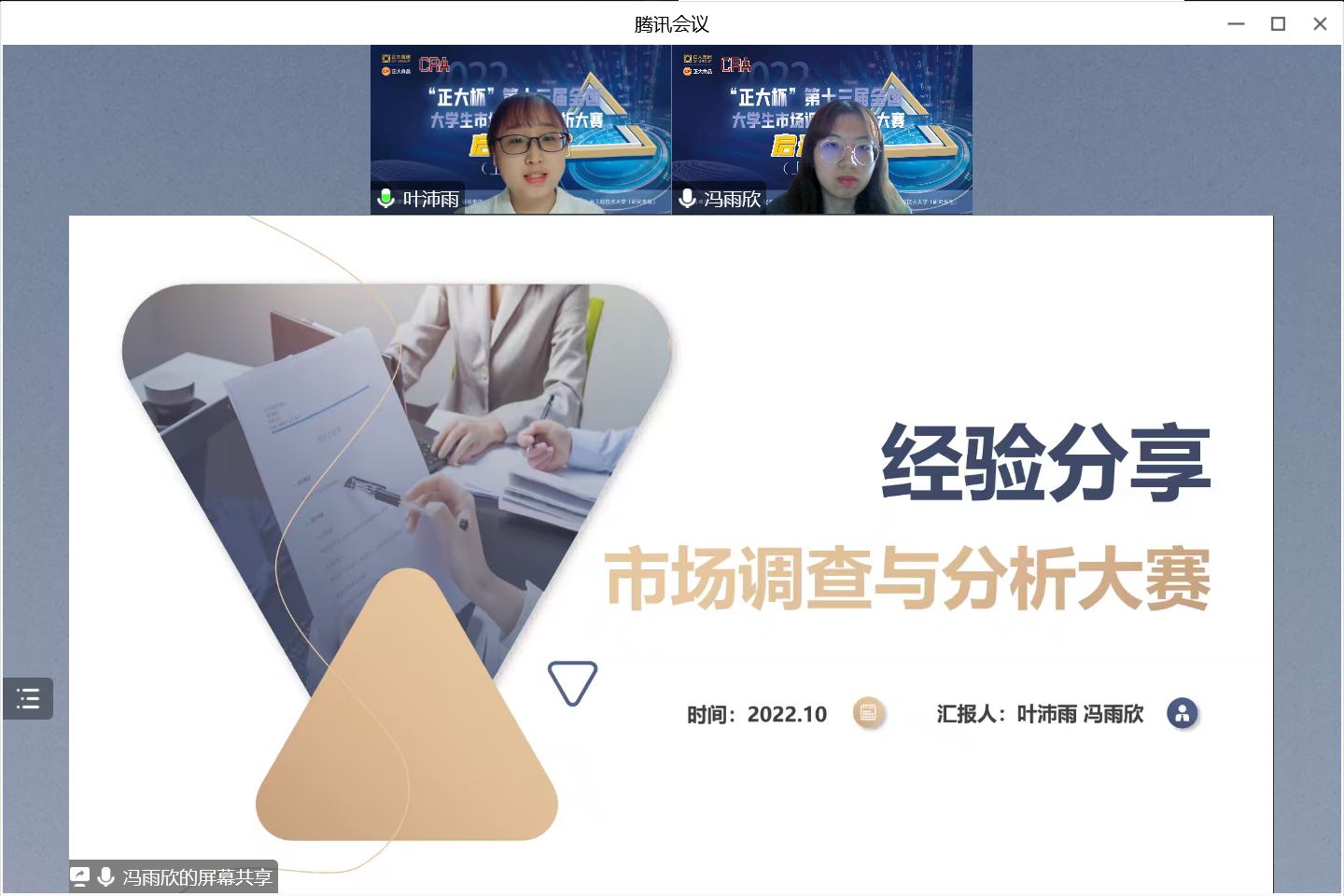华东师范大学的山俊哲同学表示市调大赛的特点是战线长,所以需要参赛者们要为每一个时间节点做好充足准备,并在参赛阶段做好充分的实践安排。在选题方面,他建议同学们可以去官网查看往年的参赛案例以获得启发,选题可以根据兴趣、特长、知识结构,把思路打开,确定研究问题时要抓好问题的深度挖掘,切忌大题小作、小题大做,研究目标不在于多而在于精。在模型的选择上,他指出不需要为了高大上而特地选择复杂难懂的模型,符合研究目标和已收集数据的,与结论相契合的模型才是最好的模型。除此之外,也要注意和指导老师的沟通,可以提高整体效率。 上海交通大学的李耿铭、施以茵、葛涵露同学分享参赛体会。李耿铭表示,明确任务分工是小组合作中重要的一环,对于文字工作,问卷撰写与发放、数据清洗和模型分配等部分,各个组员要根据自己擅长的领域选择,而组长在这其中有着重要的督促协调作用。施以茵强调美观性是答辩时隐藏的重要因素,答辩时的ppt要注意美观性和直观性,注意汇报内容的大众化和简化逻辑线。葛涵露总结了从参赛经历中得到的反思与收获,她说这样从0到1的完整市场调研项目对自己后续的的学习生活产生了很大的影响,自己各方面的能力在无形中提高很多,同时,她也反思当时如果小组能更加积极地与老师沟通,或许能够更加高效快速进行比赛的准备,少走一些弯路。 365上市公司的叶沛雨、冯雨欣同学作为往届代表,表示从参赛选手和实际操作的角度帮助大家,叶沛雨指出在选题时要多关注校园热点和现实问题,并且拿往年或将比赛的选题做了举例讲解,让大家对选题这一内容有了更深的了解。冯雨欣则表示,大赛需要学生在短时间内自主学习不同的统计方法,这对于非统计相关专业的同学是一个挑战,这时团队合作就成为可以提高学习效率的秘诀,团队成员分别学习不同模块再进行交流,会大大提高学习效率,而在实操统计时,也不用因为之前从未接触过而担心害怕。备赛就是这样一个从无到有,从0到1的过程。最后,她们为同学们分享了答辩时的小技巧。