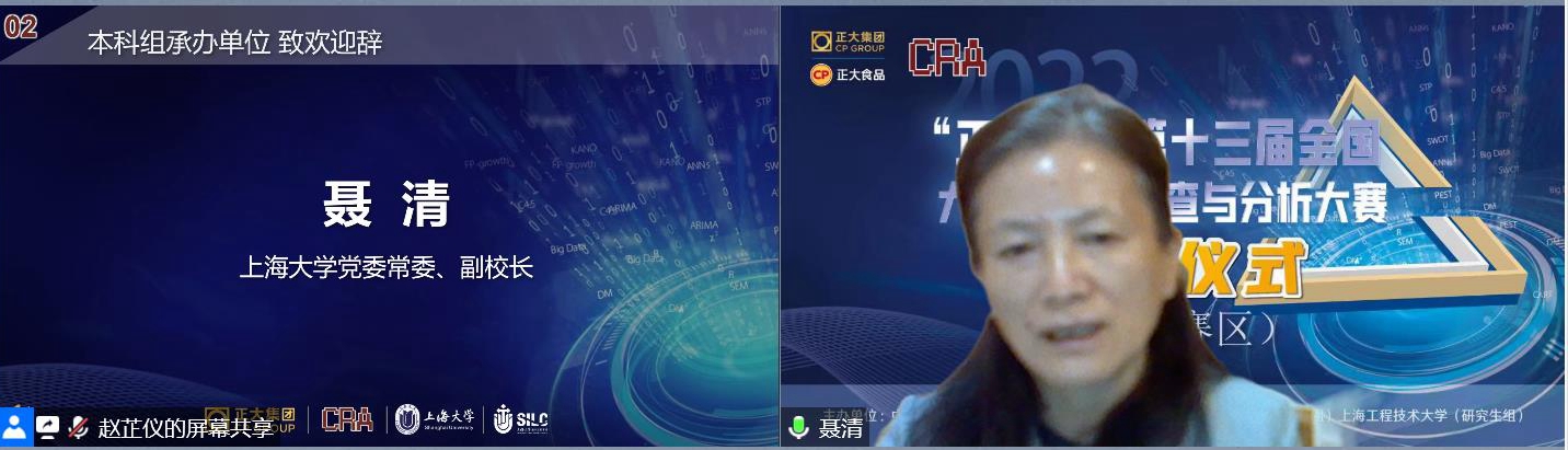 研究生组承办单位上海工程技术大学发展规划处处长、高等教育研究所所长、学科建设办公室主任殷志祥在致辞中介绍了此次承办大赛的数理统计学院,指出当前快速发展的社会需要各方面综合发展的人才,在新形势下,只有具备更好的职业技能,才能在社会有立足之地,而市调大赛正好为同学们提供了一个广阔的平台。大赛的宗旨是引导大学生创新和实践。通过参加大赛,大学生组织策划调查,实施数据处理和分析等专业实践的能力得到了提高,社会责任感、服务意识、市场敏锐度和团队协作精神也得到培养,促进教育链、产业链和人才链有机衔接,为社会经济发展服务。 正大分公司代表、上海卜蜂莲花首席运营官张文权强调市调大赛历来是正大集团重视的项目,是正大集团践行利国利民利企业经营宗旨的一种表现。百年大计教育为本,教育是民族振兴和社会进步的基石。坚持教育是为社会主义现代化建设服务,为人民服务。她表示,希望全国参赛大学生都通过以赛代训,以赛会友的形式促进综合能力的发展,通过学校的交流探索,新思路碰撞新理念,达到创新能力的提升。 南京邮电大学的孙建敏作为评委代表发言。他表示,市调大赛是全国一流的赛事,也是各项高校相关专业教学活动的一项大事,是为同学们提高组织策划、调查实施大数据分析,数据建模等技能水平搭建的一个很有效的平台,更是同学们整体技能水平的一次大展示。在祝愿参赛同学们赛出风格赛出水平的同时,他代表评委承诺将尽最大努力,秉承公平、公正、公开的原则,遵照评分细则,严肃认真,高度负责地完成各项服务工作,携手共进,为大赛的顺利召开保驾护航。 西安建筑科技大学的李从容和西南交通大学的刘赪作为指导教师代表发言。李从容分享了她参与指导学校市调大赛多年以来的经验,她谈到,比起单纯指导作品,老师更应该孵化作品,在学生自主选题的基础上对专题定点研究。老师应当担任好鼓励学生莫负韶华积极投入调查实践的工作,支持学生的赛前动员,并做好赛中陪伴、赛后总结工作。刘赪从六个竞赛指导环节做经验分享。她强调,要组建一支优秀的团队,跨学科成员间知识结构差异化必不可少,组员之间既要分工明确又要注重团队合作,高效有序的调研和工作计划的推进也是长时间备赛的关键。在选题方面,她指出要发挥学生的主观能动性,学生主导,教师把关。 短暂的中场休息及直播间互动抽奖环节结束,三支往届获奖团队为本次参赛队带来宝贵的经验分享。