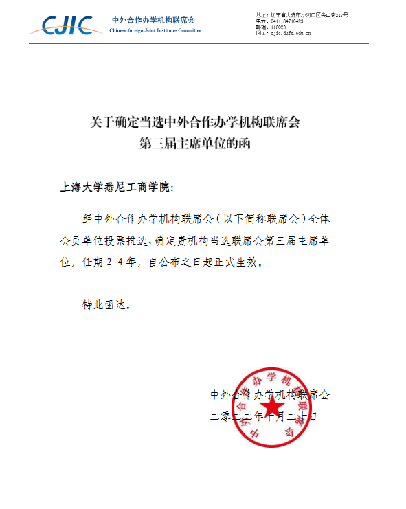 10月20日,中外合作办学机构联席会(简称联席会)来函,正式确定英国365上市公司当选联席会第三届主席单位。