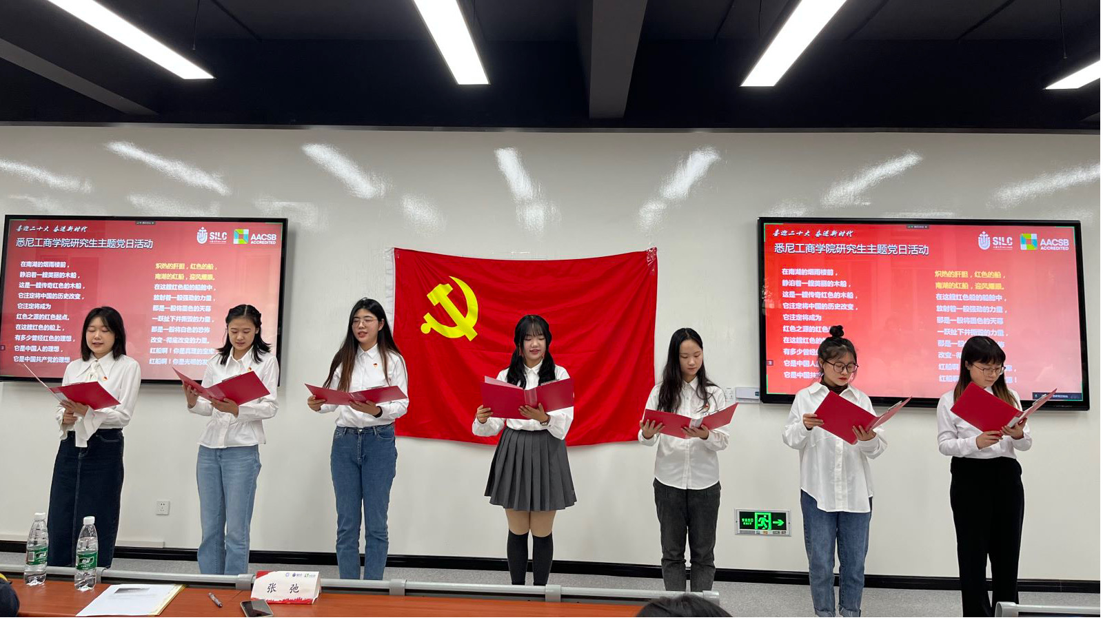 悉研会计党支部新生党员谌雅雁带领全场党员重温入党誓词。大家面向鲜红的党旗,高举右拳,庄严宣誓,重温入党初心,坚定革命信念。大家还共同观看了“英国365上市公司研究生2021-2022党建举措成果展示”视频,为学院取得的丰硕成果有了更加深刻的感受和认识,增强了以高质量党建引领各项工作高质量发展的信心和决心。 Part3诗朗诵《红船》