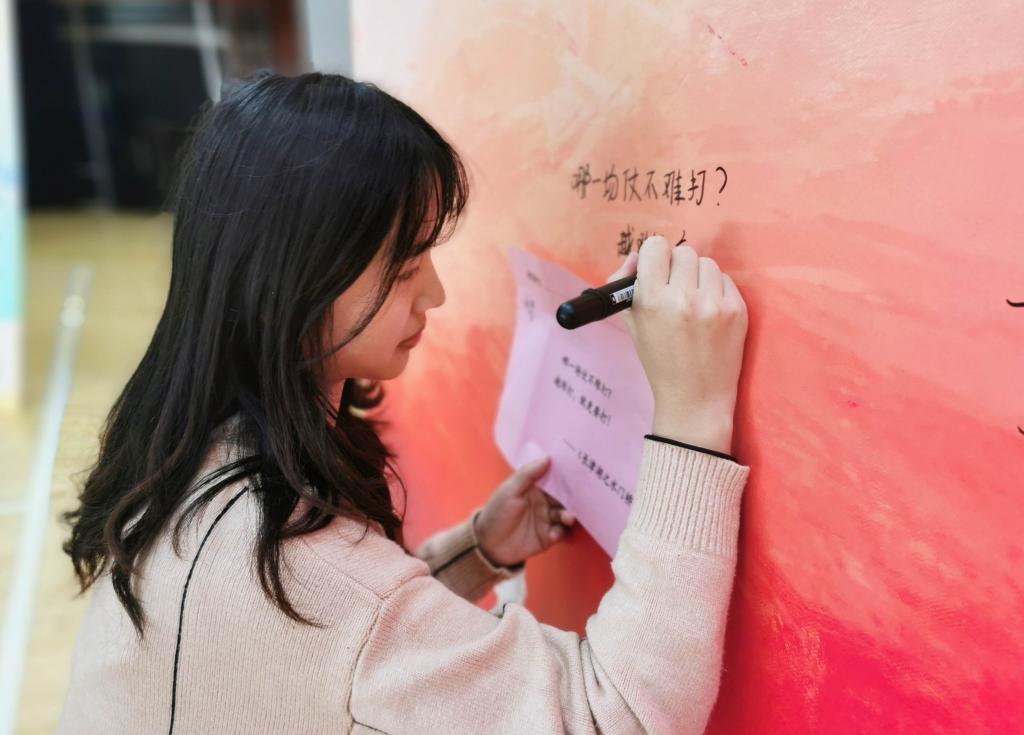 为激励悉研学子勇于担当,本次展会还设置了“无惧风雨、乘风破浪”台词墙。到场同学亲笔书写“无畏”台词,表达“敢无畏可有为,新青年当有为”的青春态度。 参展学生纷纷表示,作为新时代青年,要以赤诚之心、昂扬之姿、奋进之势,坚决扛起历史使命,努力争取在青春的赛道上跑出最好成绩,以优异成绩庆祝党的二十大胜利召开! |