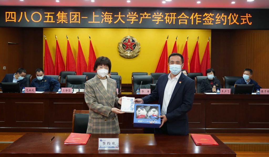 卫静芬副书记代表学院向四八〇五集团赠送了学院吉祥物和总结上大悉商建院25年来办学历程和特色经验的专著《悉商之路》。
