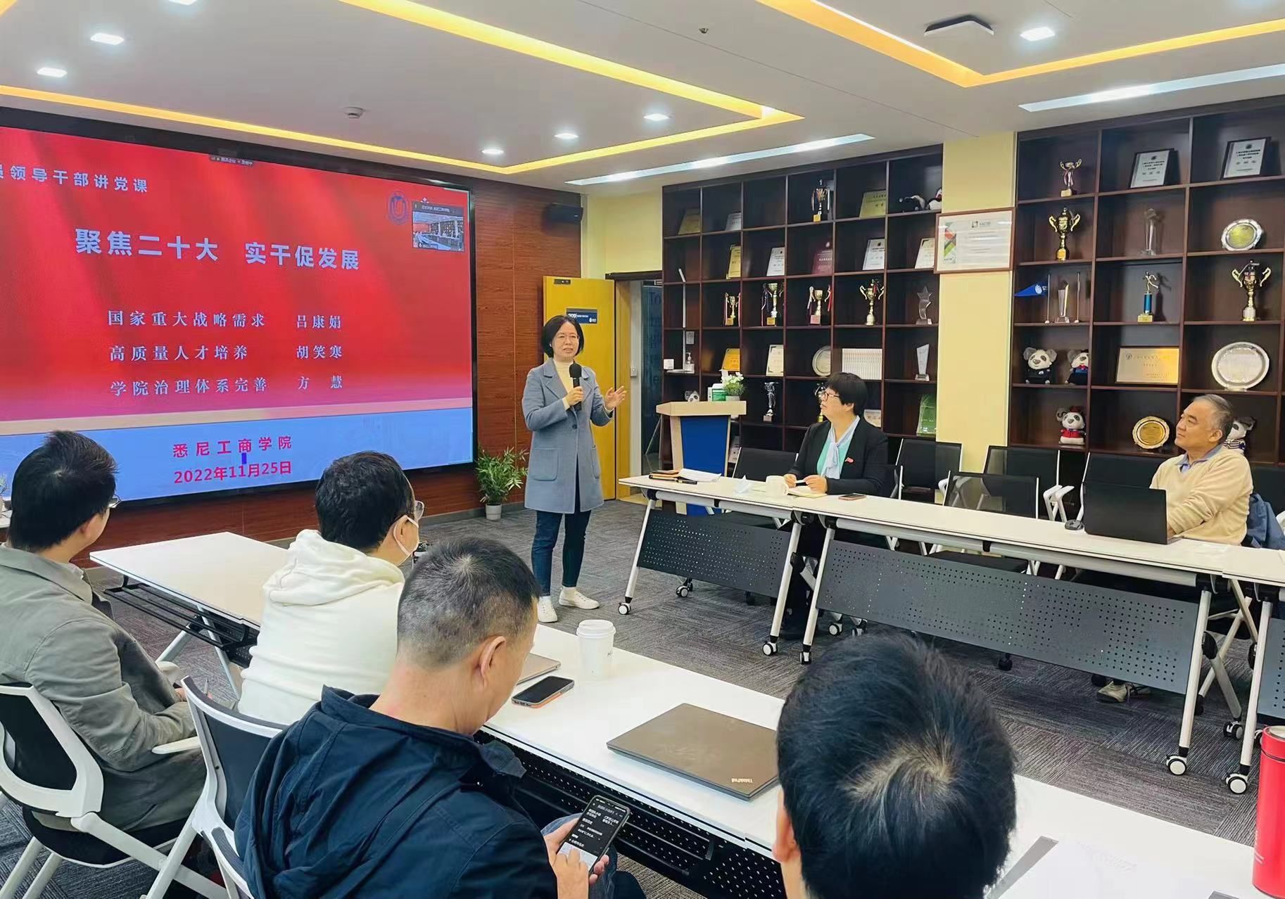 方慧副院长引述了二十大报告原文,“要完善社会治理体系,健全共建共治共享的社会治理制度,提升社会治理效能,畅通和规范群众诉求表达、利益协调、权益保障通道,建设人人有责、人人尽责、人人享有的社会治理共同体”,结合学院工作需要,阐释了学院近年来在绩效管理制度等治理体系方面的重点举措,号召大家坐言起行,行而不辍,把二十大报告重要精神的学习落到实处。