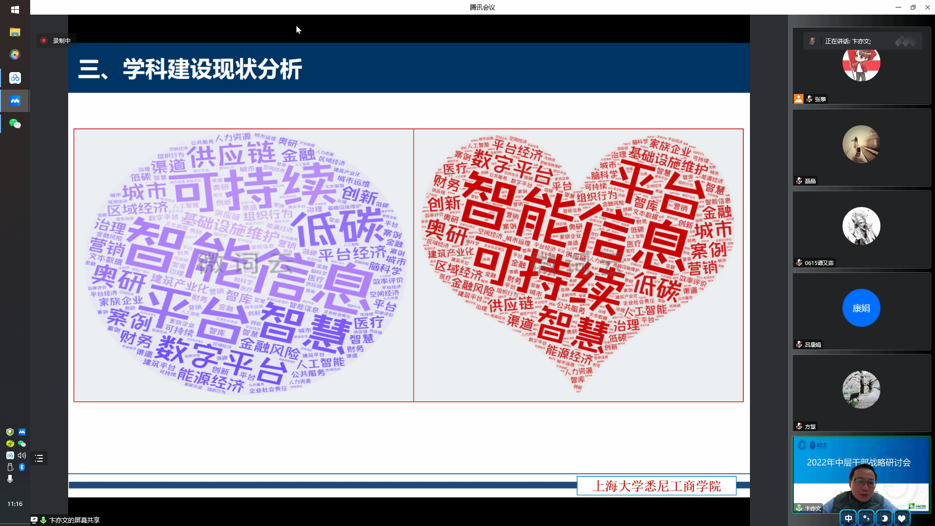 12月22日,学院中层以上干部年终战略务虚研讨会在线召开,学院领导班子及各系部正副主任参会。 经金系、工管系、财会系、信管系、英语系分别汇报了今年主要工作和亟待解决的问题以及明年科研、学科、人才培养等方面的重点突破规划。市场部、学工部、研究生管理部、国际部、教学管理部、外联部、创新管理部、院办分别从问题导向出发,直击工作中的难点和痛点,就如何在行政工作中提质增效开展了广泛的讨论。