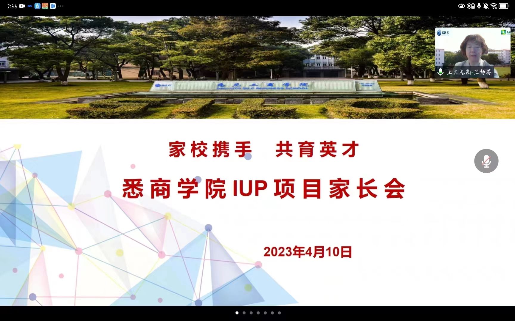 卫静芬从学生工作与学生培养的角度,对学校及学院人才培养理念、学工队伍力量保障、学生培养平台搭建、学科竞赛、创新创业工作及职业生涯教育等方面向家长们作了全方位解读。为更快帮助同学们适应大学校园生活,她结合多年工作经验给出2大共识5大建议,希望同学们守好底线,学有所成,期待每一位新生在悉商成功开启成才之路。 柯佳围绕IUP项目建设初心及发展历程展开发言,她罗列数据,简要概括项目发展历史、特点及优势,详细介绍了项目学生的出路,打消了家长的疑虑。她希望同学们能守住学业及纪律的两条底线,紧跟IUP项目指导,对接海外名校,在未来人生路上华丽转身。 张冰冰从高质量教学保障、IUP学业安排及课外活动等方面做了介绍,向大家明确学业规则及学院提供的强大学业支撑体系,细数校友风采,坚定家长选择IUP的信心。除此之外,她提出学院还倾力打造了IUP精品活动,如IELTS口语模考一对一、StudyHall、主题课堂等,从软件到硬件都全面服务学生,全力保障学生的成长成才。 丁莺向家长们介绍了学生第一天课堂学习情况。她传达了任课老师对新生们课堂表现的充分肯定和赞扬,使家长了解孩子们在校的学习状态。良好的态度是成功的开始,丁老师强调项目将主抓学风建设,同时公布了自己的联系方式,希望家校共同发力,保障同学们学业有成,秋季顺利升学。