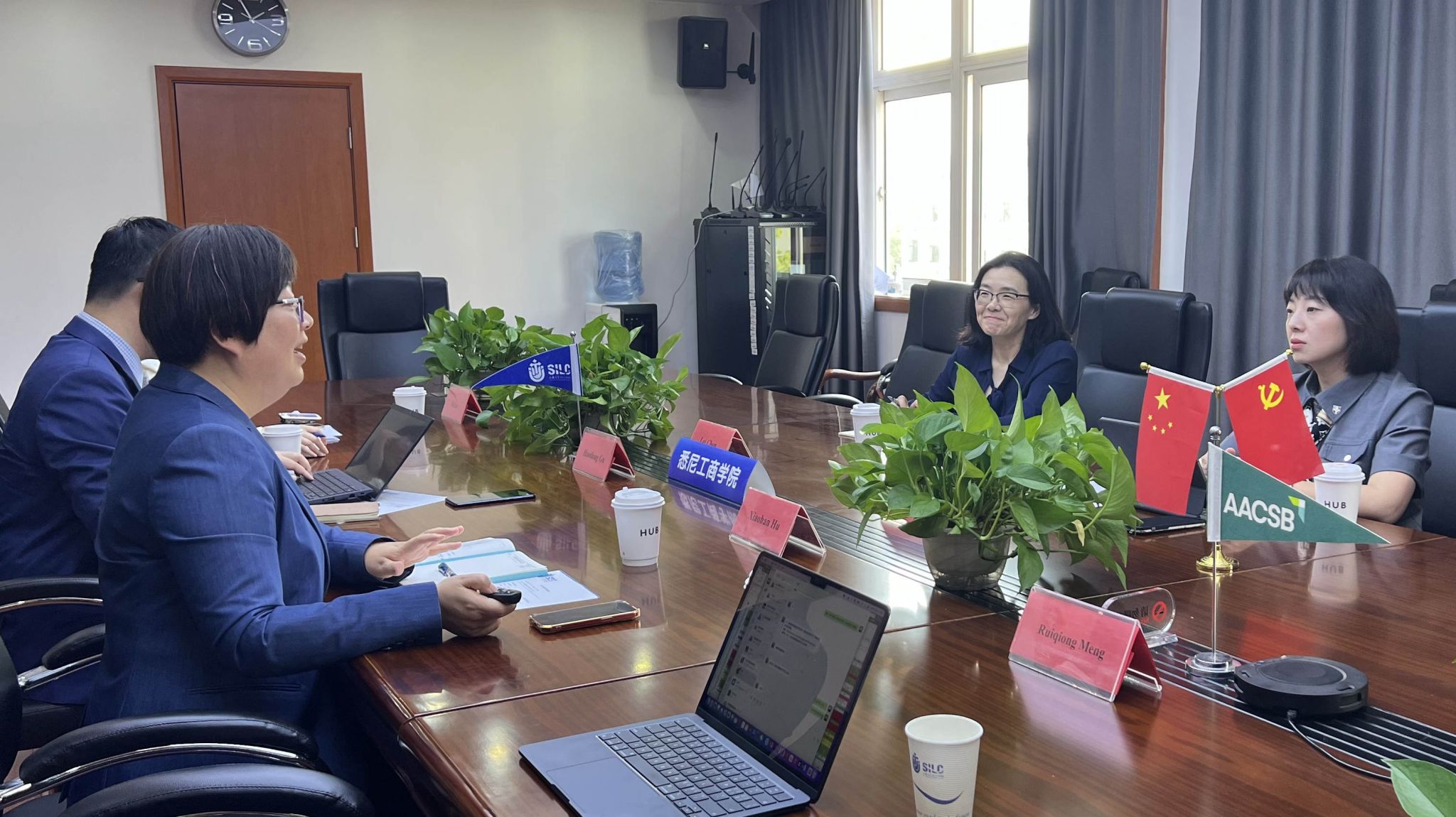 4月17日下午,英国拉夫堡大学国际合作交流部项目经理Lu Bai, 商学院会计财务组副组长、会计与金融高级讲师Lei Chen来院交流访问。我院副院长胡笑寒、国际部主任顾浩东、国际部副主任孟瑞琼、财会系讲师陆叶与来宾在文荟楼409会议室举行会谈。